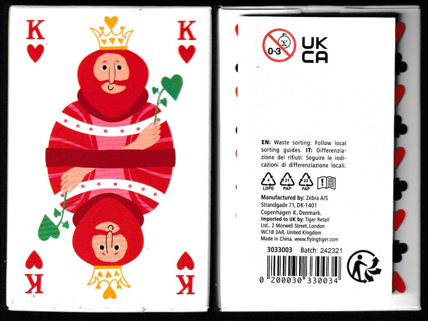 Above: Flying Tiger playing cards made in China for Zebra A/S (Denmark), imported to UK by Tiger Retail Ltd, London. 52 cards + 3 Jokers (same design in 3 different sets of colours) in a tuck box. Size: 58 x 89 mm. Purchased in London, July 2022.