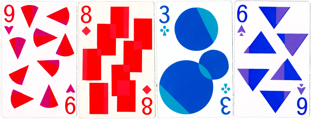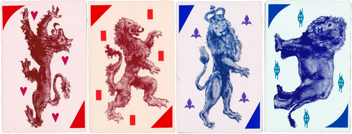 One of Thomas Damkier's ideas was to create a closer relation between the design of the courts and the number cards. The geometrical forms used for the number card designs are derived from the suit marks and the same forms are repeated in the appropriate court card designs. The Queens are framed in cropped versions of the suitmarks, the Kings and Princes again are framed by derived variations of the same forms. The number cards are divided into high and low values. Spades and Hearts are smaller than Clubs and Diamonds. The four lions on the Jokers are lions that - except for the African lion - can be found in the respective countries' heraldry.
