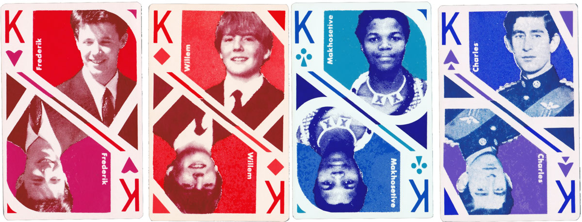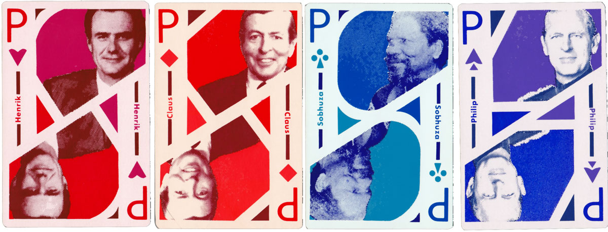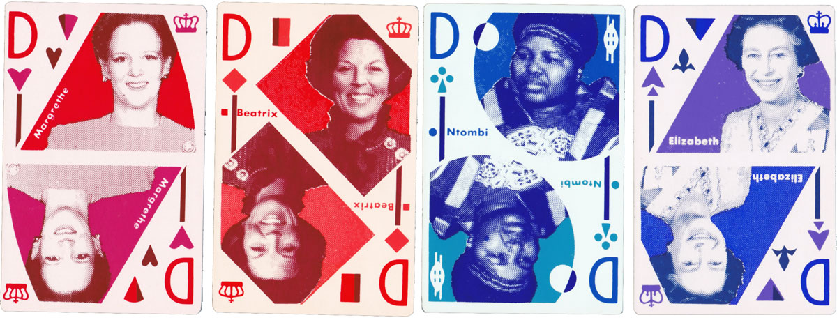 In 1988 the Danish School of Design set the examination project to design a pack of playing cards. All students passed the examination. Thomas Damkier was the designer of this royalty deck, which he called “Dronningespillet” (Game of Queens) since his concept was based upon the - at that time - four reigning queens: (in alphabetical order by kingdom) Margerethe II of Denmark, Elizabeth II of Great Britain, Beatrix of the Netherlands and Ntambi of Swaziland.