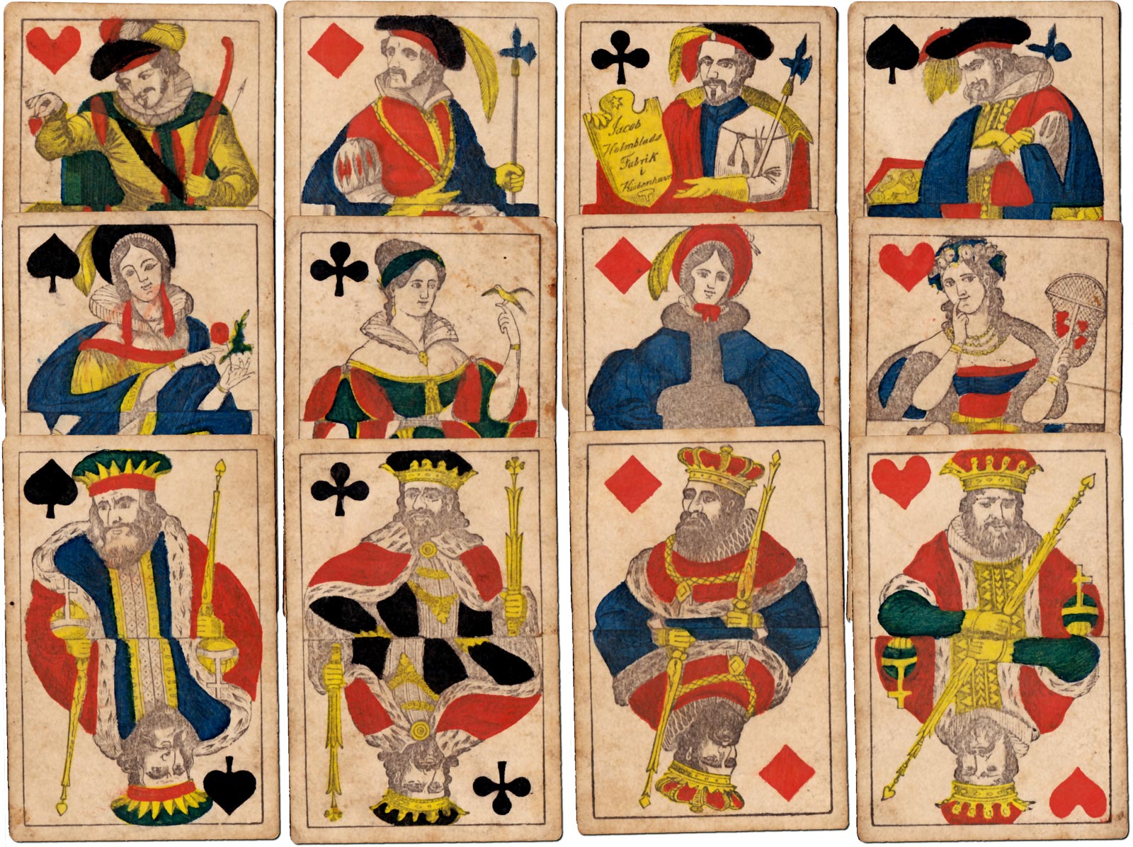 Standard woodblock and stencil deck produced by Jacob Holmblad with double-ended court cards in the ...