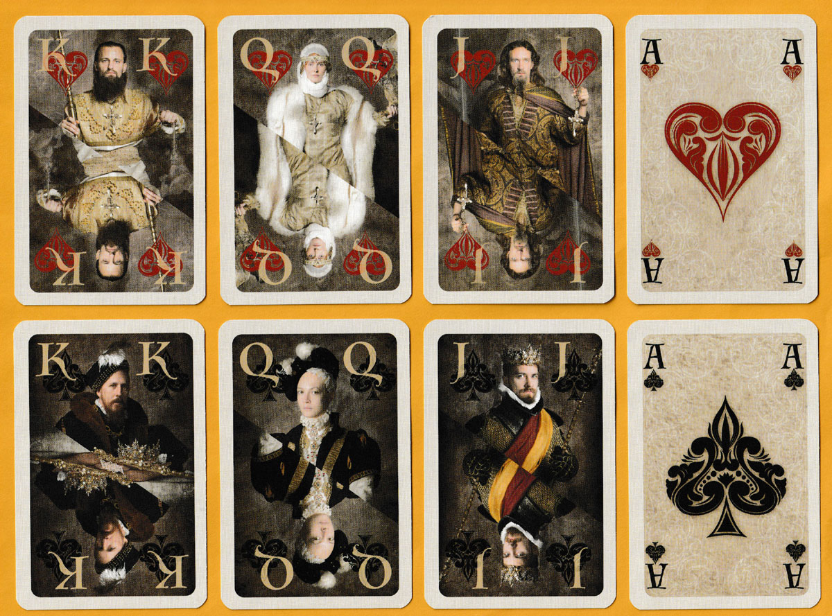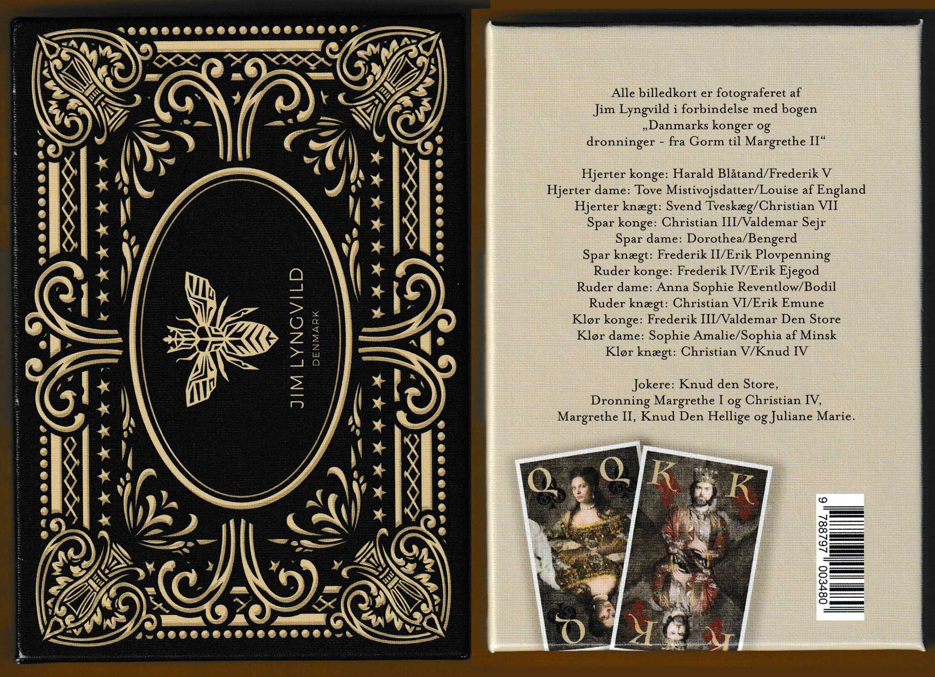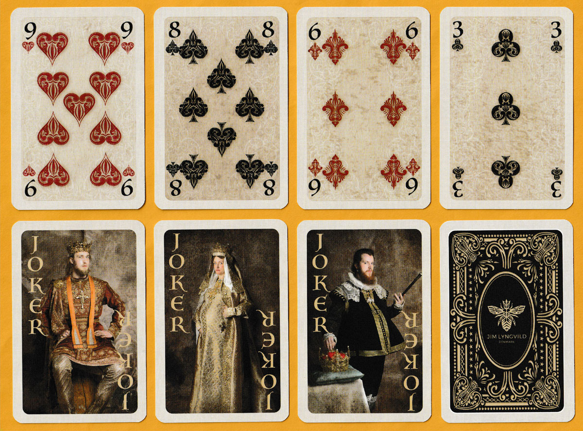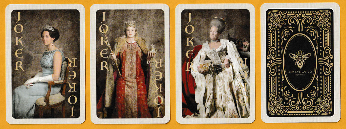 Jim Lyngvild (b.1978) is a Danish designer, writer, photographer, fashion columnist and television personality. After designing an exhibition about the Viking Age for the National Museum of Denmark in 2018, one of his next projects was the creation of a series of photographs depicting Danish royalty but using present-day models dressed in appropriate costumes. A single pack with photos of some of the monarchs was issued in 2020. Two years later, this was extended to become a double pack including the then queen, Margrethe II, as one of the Jokers. The courts are double-ended, while the Jokers are single-ended; all are set against a taupe background. Large, decorated suit-signs are used on the aces, with smaller versions of these on the courts and numeral cards. The back design is identical on both packs • See the box