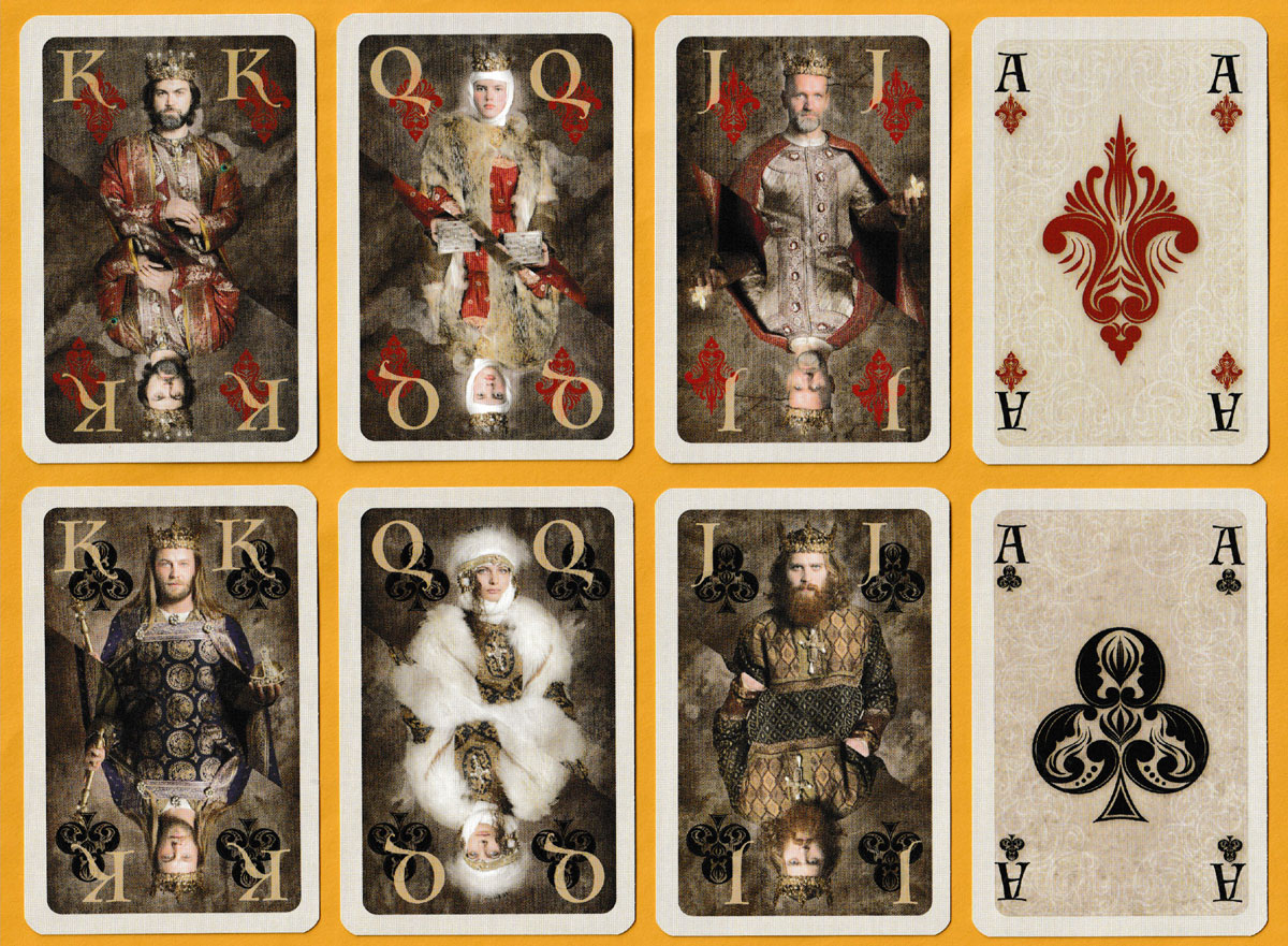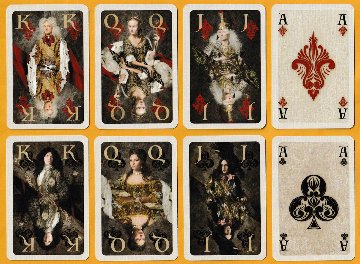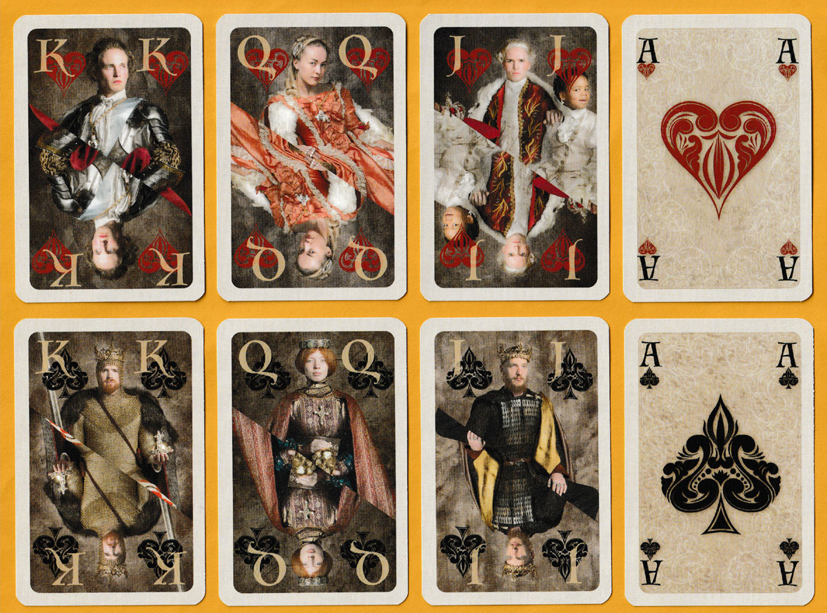 Jim Lyngvild (b.1978) is a Danish designer, writer, photographer, fashion columnist and television personality. After designing an exhibition about the Viking Age for the National Museum of Denmark in 2018, one of his next projects was the creation of a series of photographs depicting Danish royalty but using present-day models dressed in appropriate costumes. A single pack with photos of some of the monarchs was issued in 2020. Two years later, this was extended to become a double pack including the then queen, Margrethe II, as one of the Jokers. The courts are double-ended, while the Jokers are single-ended; all are set against a taupe background. Large, decorated suit-signs are used on the aces, with smaller versions of these on the courts and numeral cards. The back design is identical on both packs • See the box
