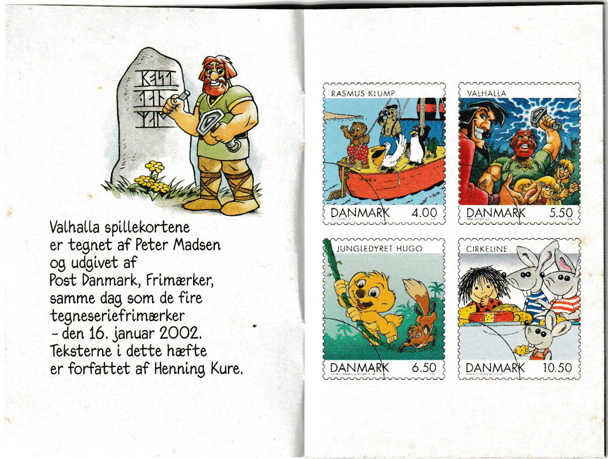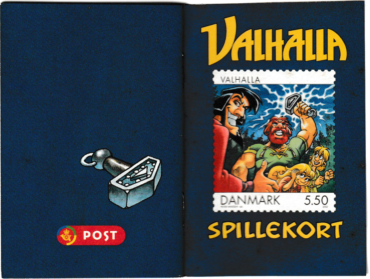 When the Danish Post Office (Post Danmark) issued a set of four stamps in 2002 celebrating famous Danish comics and children’s films, they also put on sale a pack of cards depicting 13 different characters from Valhalla, a Danish comic series represented on the 5.50 krone stamp. The stamp is shown multiple times diagonally on the reverse, while the courts and Joker depict named characters from the comic series.