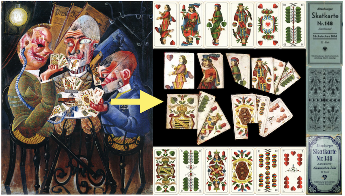 In 1920 Otto Dix completed a painting entitled "Card Playing War Cripples" which is at the Neue Nationalgalerie in Berlin. As you can see from the picture they match 'Attenburger Stutkarte Nr 148'. Both the packets I have found are from after WW2. What I can't seem to find is cards dating or pre dating the painting. I think they might have been originally produced by Stralsund ? but that's a real shot in the dark.