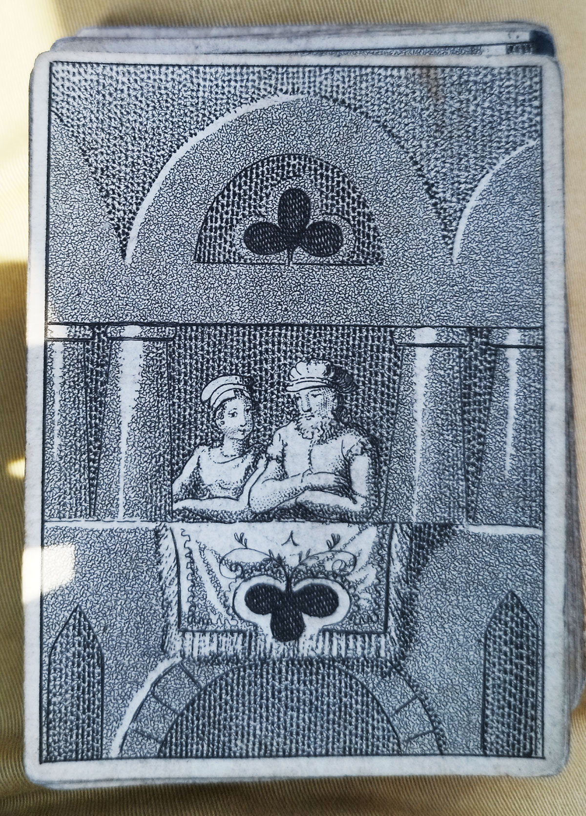 I’ve come across an antique deck with unique illustrations and some hand-colored cards. One card mentions “Wien bei H.F. Müller,” suggesting it might be Austrian.