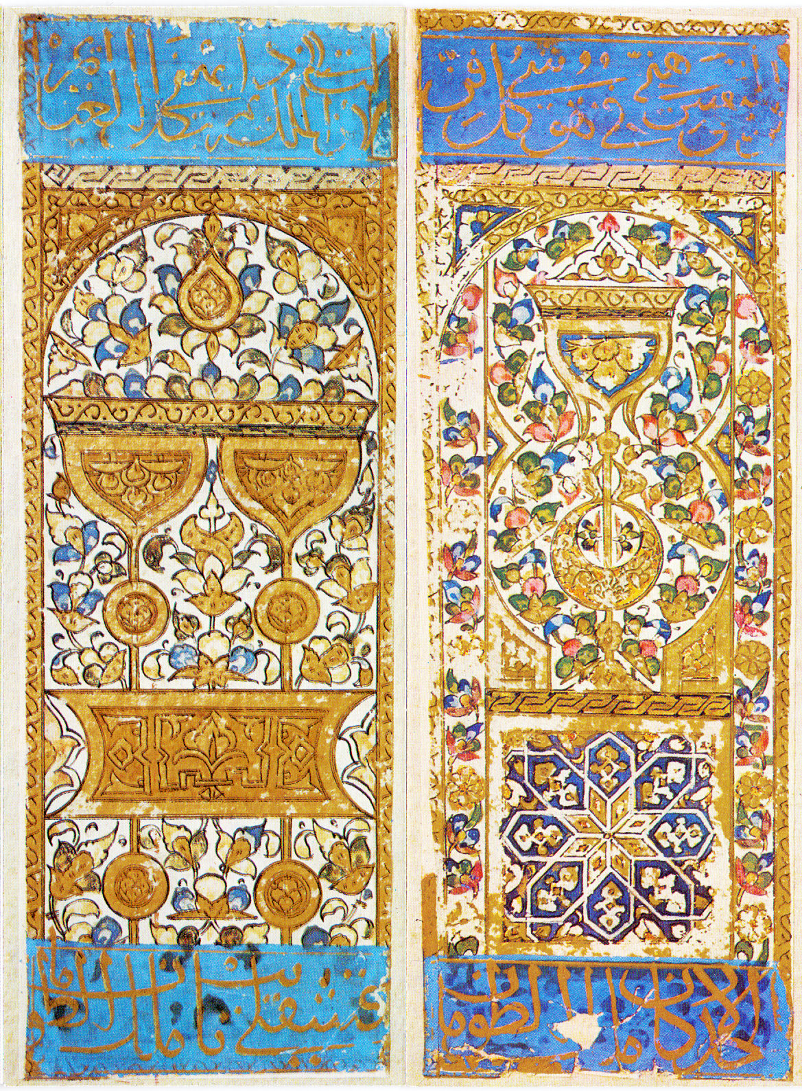 Two court cards from the Mamluk naib pack (Topkapi Palace group, 15th–early 16th century): the King and Lieutenant (naib) of Cups. Rank is shown through inscriptions and ornament, rather than human figures. The paired cup emblems identify the suit, while the blue calligraphic panels and rich decoration mark these as high-status cards—key evidence for how a structured four-suit pack could have travelled into Europe via Mediterranean trade routes.