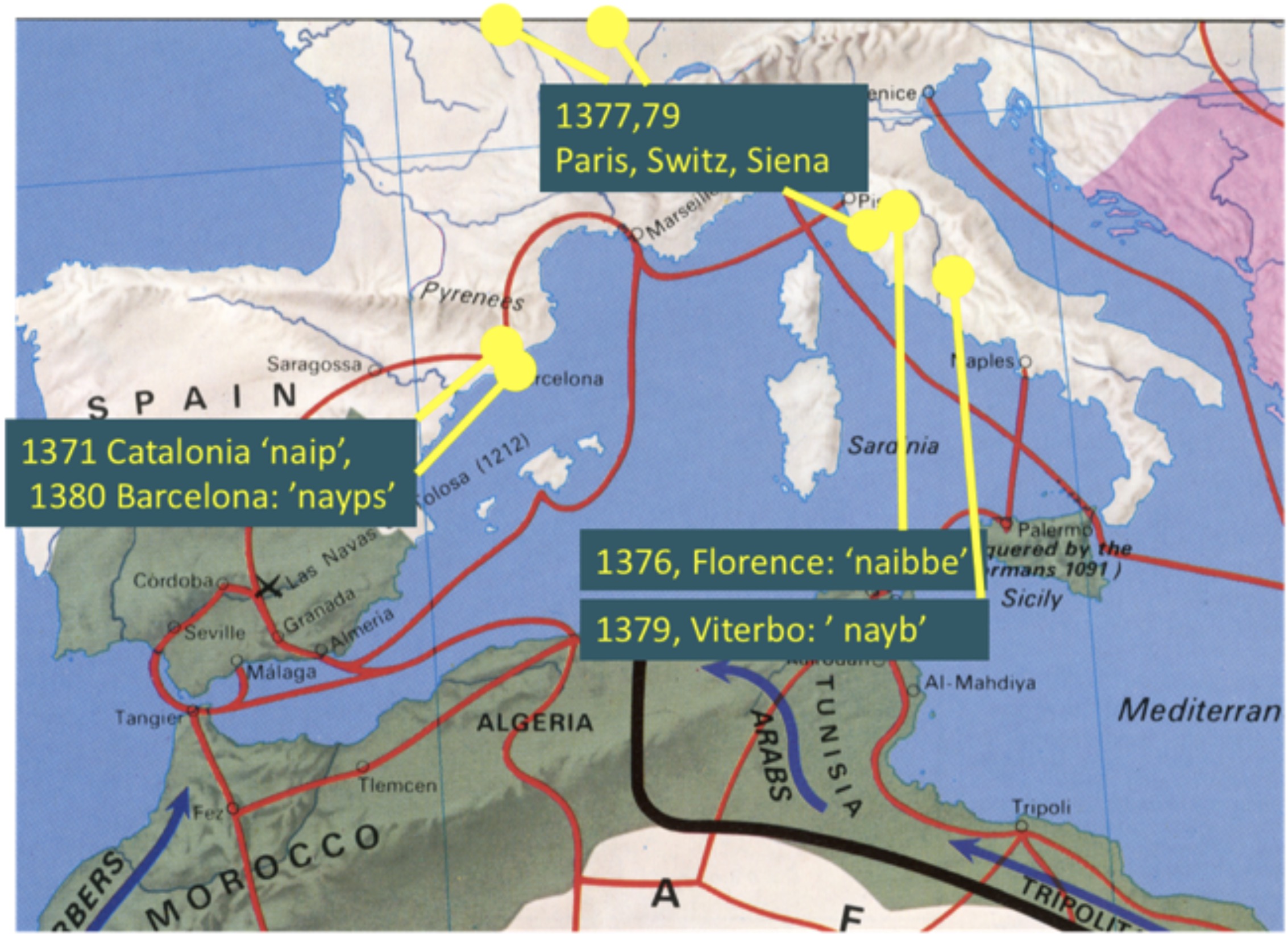 Above: early European references to playing cards (1371–79), plotted against the medieval Mediterranean world. The red lines indicate major mediaeval trade routes; the coloured areas show contemporary political regions. The first recorded ‘naib/nayb’ mentions cluster at port cities along these routes, suggesting transmission into Europe through established trading networks.