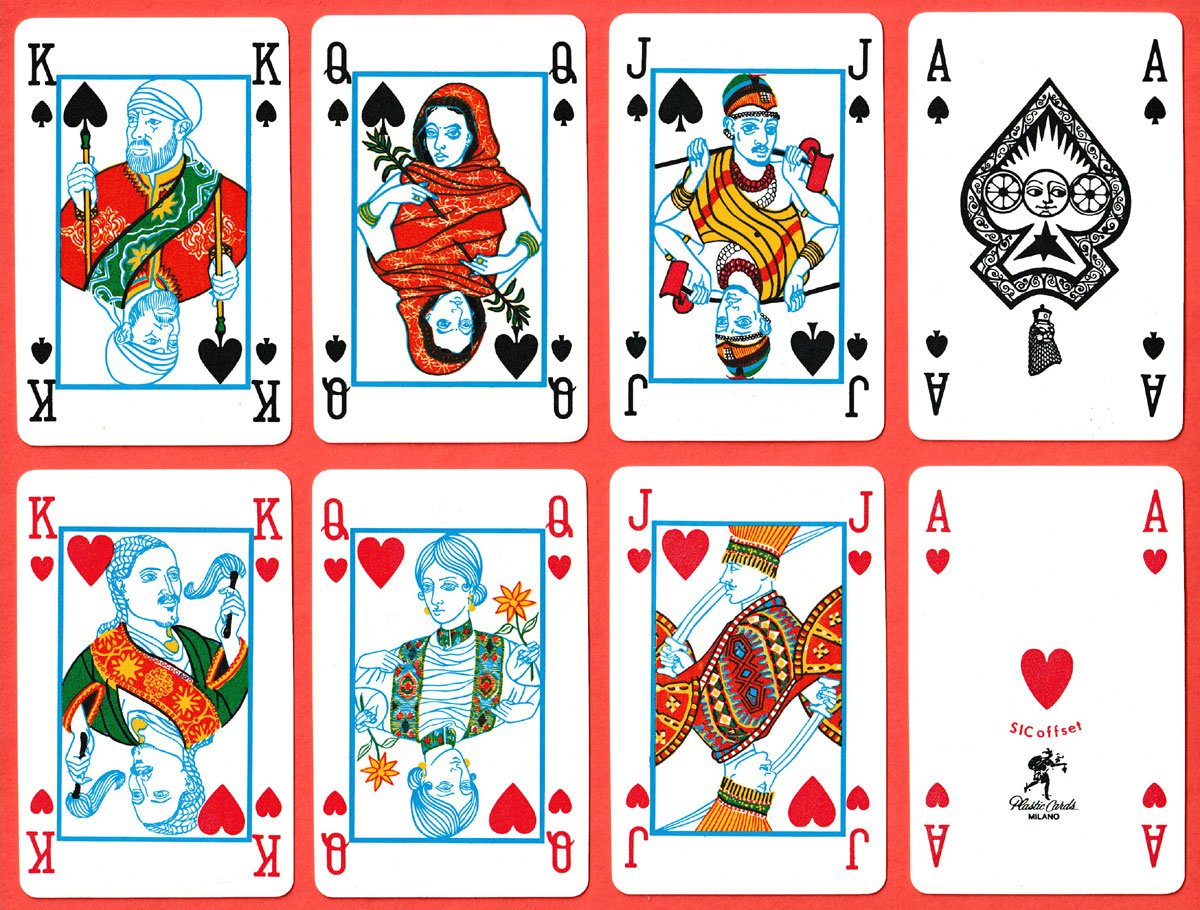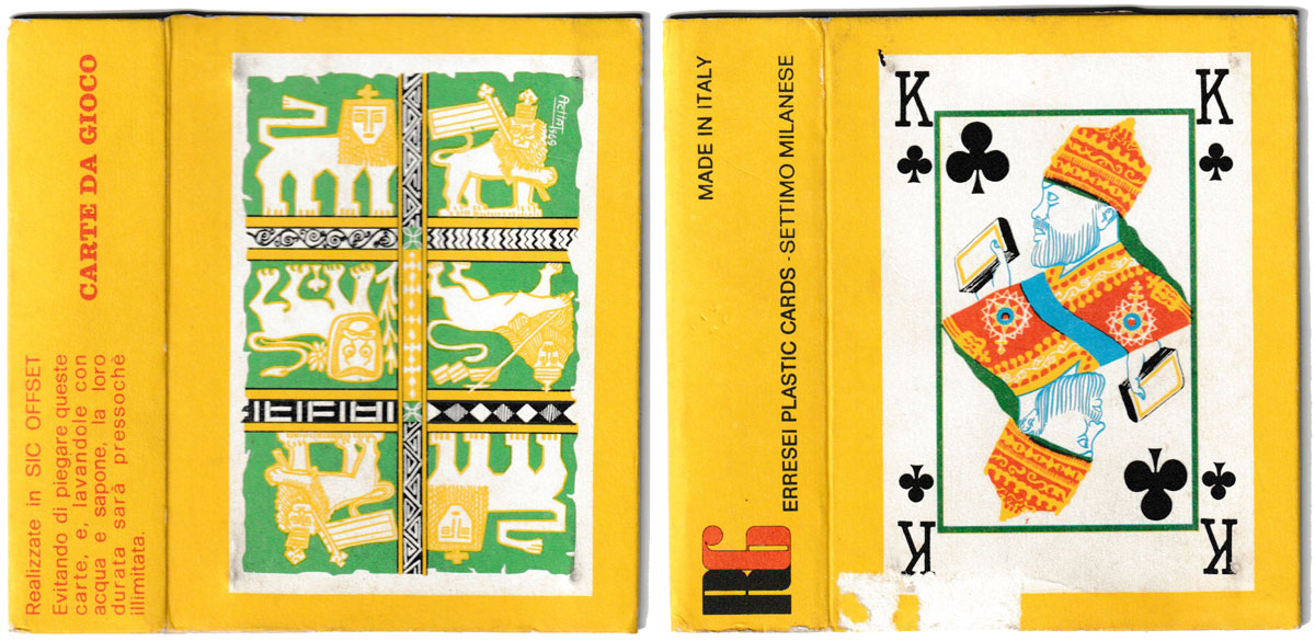 Above: Ethiopian playing cards made by Erresei Plastic Cards, Milan, Italy, c1980. 52 cards + 2 Jokers + 2 extra cards in black plastic drop-lid box with illustrated cardboard sleeve. Size: 57.5 x 89 mm.