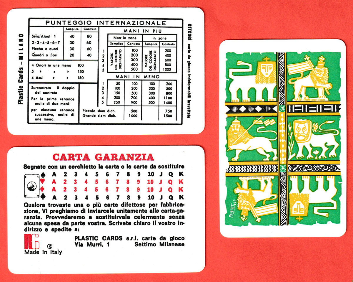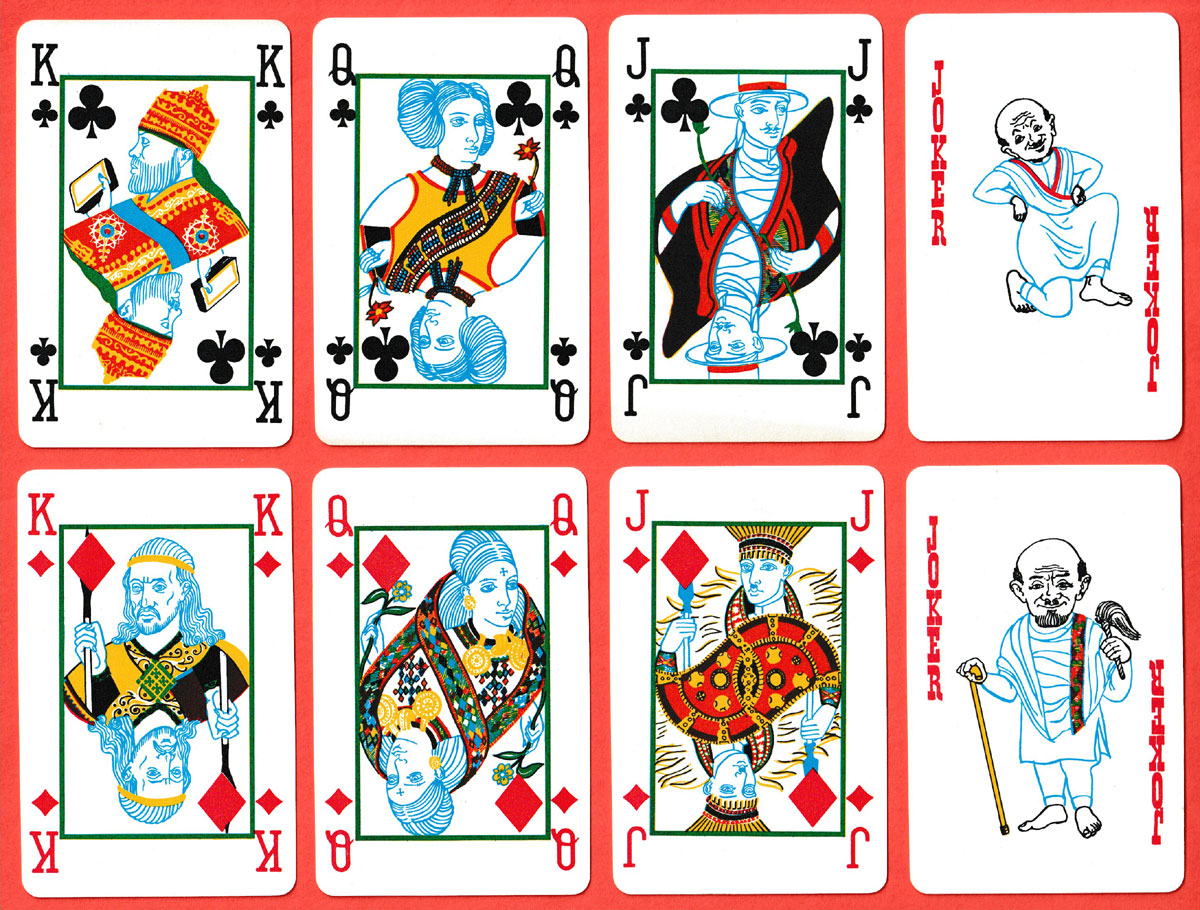 Many different ethnic groups go to make up the population of Ethiopia. Some of them are represented here in the crisp designs to be found on the double-ended court cards. The Ace of Spades is decorated, with the head of a lion wearing a crown at the foot. There is no official title for these cards on the sleeve nor is it known whether they were produced for a particular customer. The back design features the Lion of Judah six times in yellow and white against a green background. There is also what could be an artist’s signature and date on the back (ACHAT or ACHAI 1969?). The cards are all plastic.