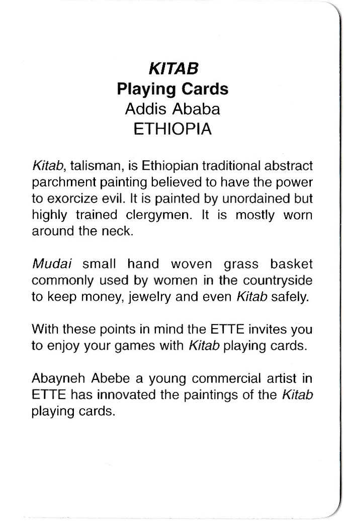This undated boxed double pack of 55 cards includes two Jokers and an explanatory card. It was published by the Ethiopian Tourist Trading Enterprise (ETTE). Although a non-standard pack the indices and court card rank designations are standard French / international. The artwork is by a young commercial artist Abayneh Abebe. The Kings wear a crown with the word “Kitab” clearly visible, while the Queens wear a crown showing the word “Mudai”. The Jacks’ crowns display the word “talisman”.