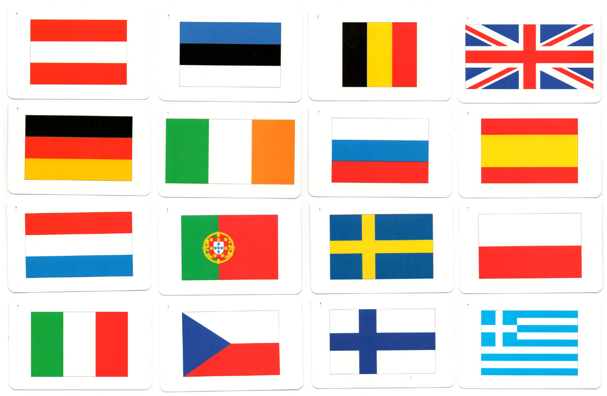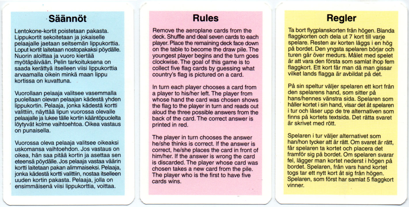 Above: the pack contains photos of Finnair’s airplanes which are removed before play, also a total of 48 flag cards with maps and country names on the reverse plus 3 rules cards in a tuckbox.