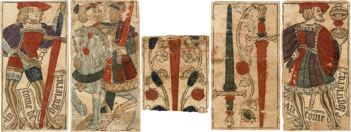 Cards from a pack of an early form of north Italian playing cards, with the swords back-to-back and ...