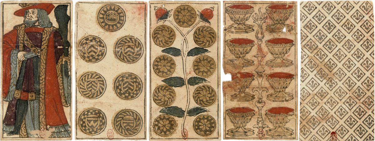 Above: Spanish-suited playing cards from several different packs published in Toulouse by Antoine de Logiriera (1495-1518). Source gallica.bnf.fr / Bibliothèque nationale de France • Jeu de cartes à enseignes espagnoles - Antoine de Logiriera►