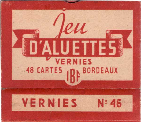 Aluette pack manufactured by Boéchat Frères, Bordeaux, c.1950. Aluette cards tend to have features found on archaic Spanish cards, and these cards are a sort of hybrid between standard 19th/20th century Aluette and the relatively modern Spanish Catalan pattern. The characteristic, slightly mischievous additions, or embellishments, to the lower numeral cards and mounted cavalières (female, no.11) are in the style of French Aluette cards, but the sotas (male jacks, no.10), kings (no.12), the Spanish suit symbol designs and anchor-caducceus motif on the four of coins are in the style of the standard Spanish Catalan pattern. The box describes the cards as: “Jeu D’Aluettes Vernies Nº 46”.
