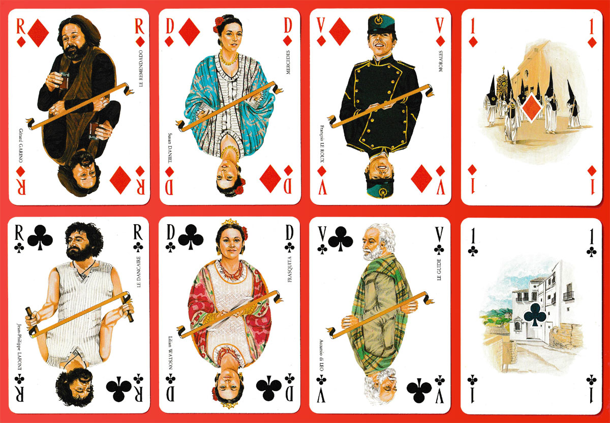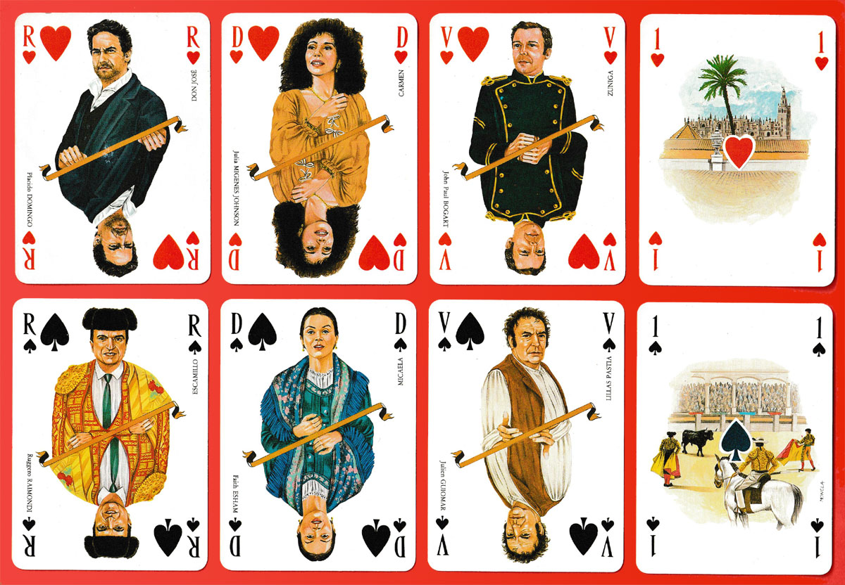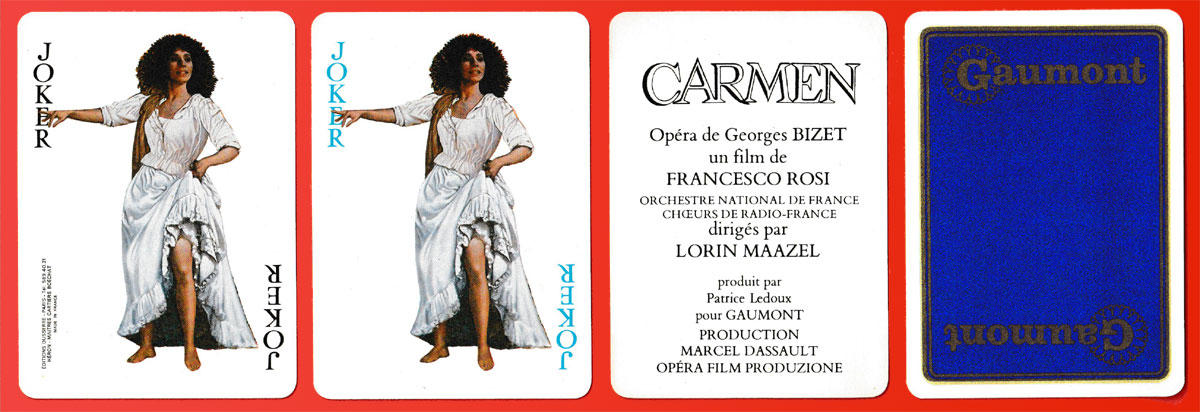 When Bizet’s most famous opera, Carmen, was turned into a film directed by Francesco Rosi, the filming took place entirely on location in Andalusia in southern Spain (Ronda, Carmona, Seville). Some of the sites are depicted on the scenic Aces. The main characters in the opera were played in the film by Julia Migenes Johnson (Carmen; QH and Jokers), Placido Domingo (Don José; KH), and Ruggero Raimondi (Escamillo; KS). The double-ended courts are drawn rather than being actual photographs but are nevertheless very realistic. Each has the name of the singer and the role they played in the film. The indices are in French. The pack was issued to coincide with the première of the film which was distributed by Gaumont, hence the back design. See the box►