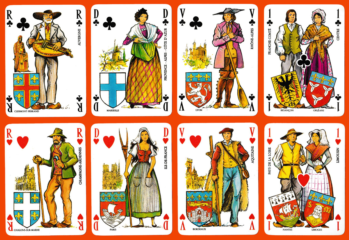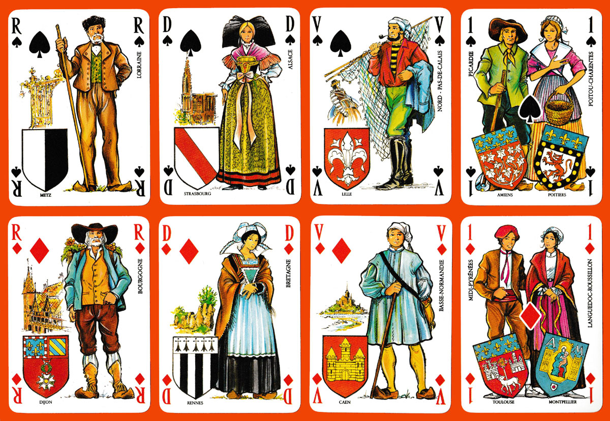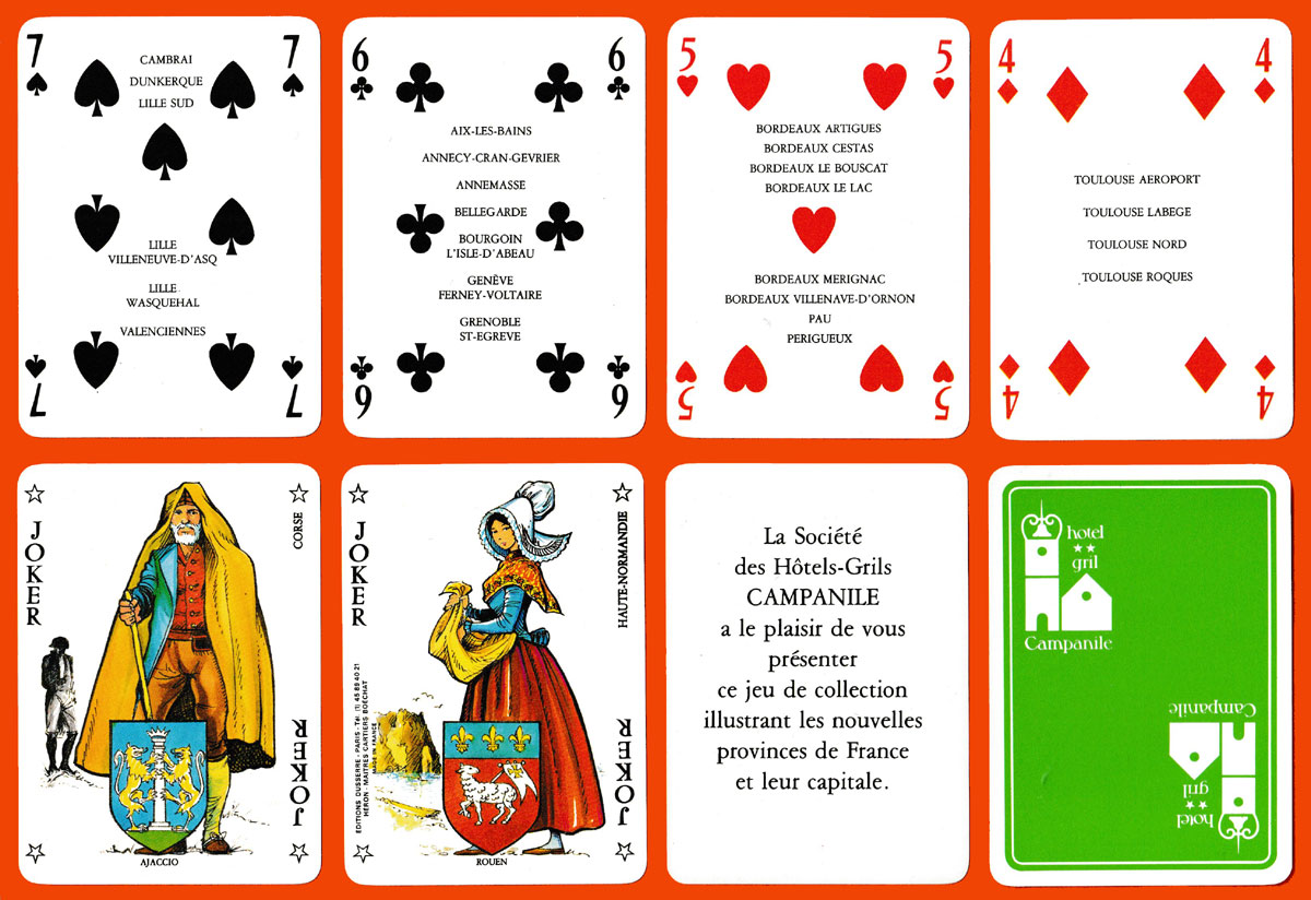 Shortly before this pack was produced, metropolitan France was reorganised into 22 regions, all of which are represented here by a male or female figure in appropriate attire – on the 12 court cards, on each of the Aces, and on each of the Jokers. Each region’s name, coat of arms and capital are also included together with a detail of a tourist site on each of the court cards and Jokers. The figures in costume are typical of the work of the well-known designer, James Hodges. Although there is no specific explanation, the names on the pip cards are presumably those of the places where Campanile hotels and restaurants can be found. All in all, an attractive and colourful pack. See the box►