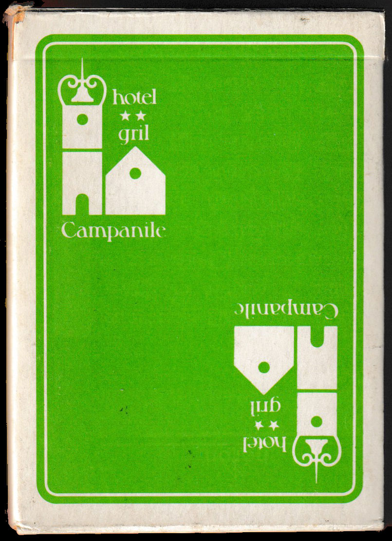 Above: publicity pack for the Campanile hotel and restaurant chain with designs by James Hodges, published by Editions Dusserre, printed by Maitres Cartiers Boéchat (‘Héron’), Bordeaux, France, c1985. 52 cards + 2 Jokers + 1 title card in tuck box. Size: 63 x 88 mm. The back and front of the box are identical.