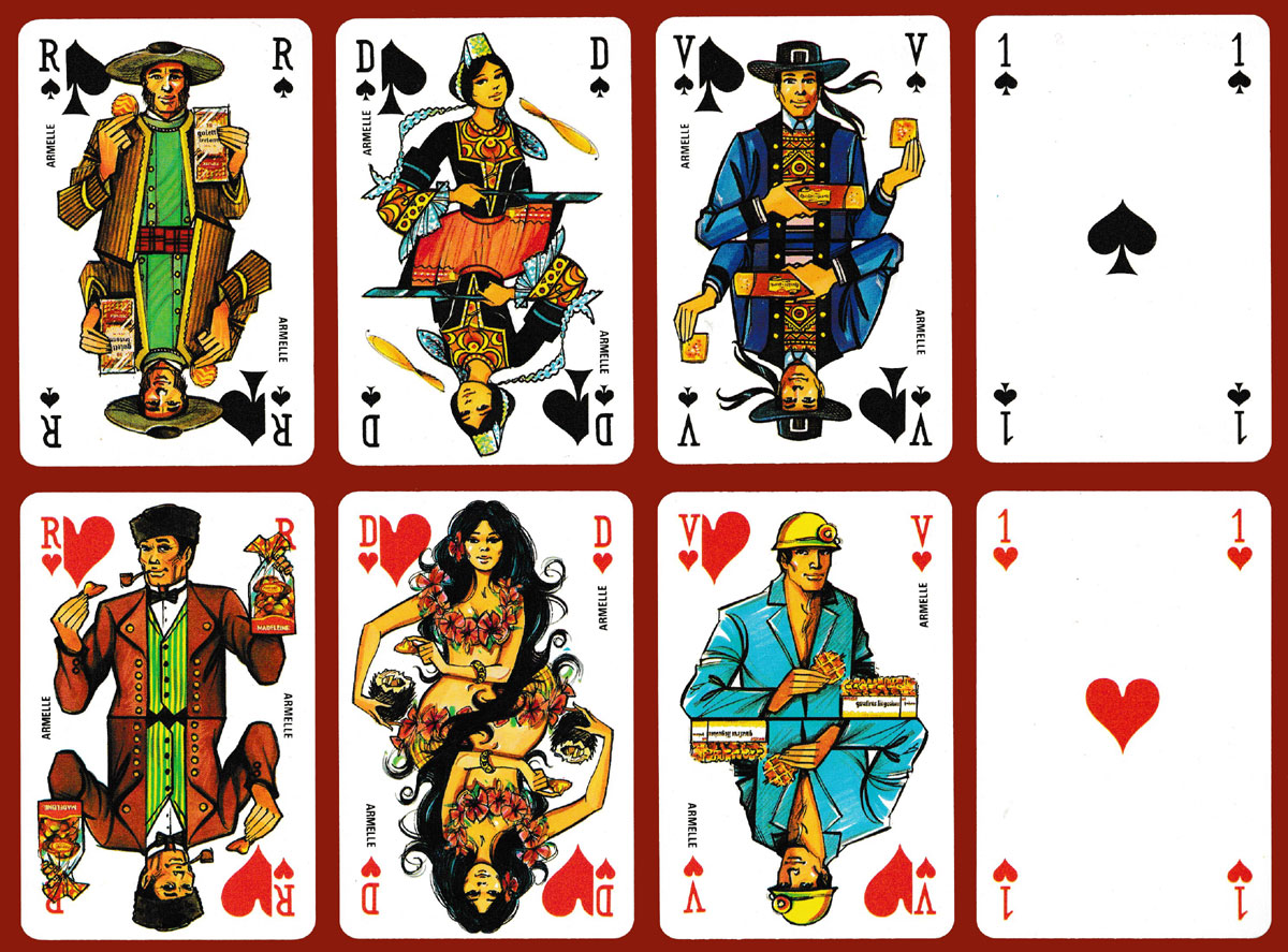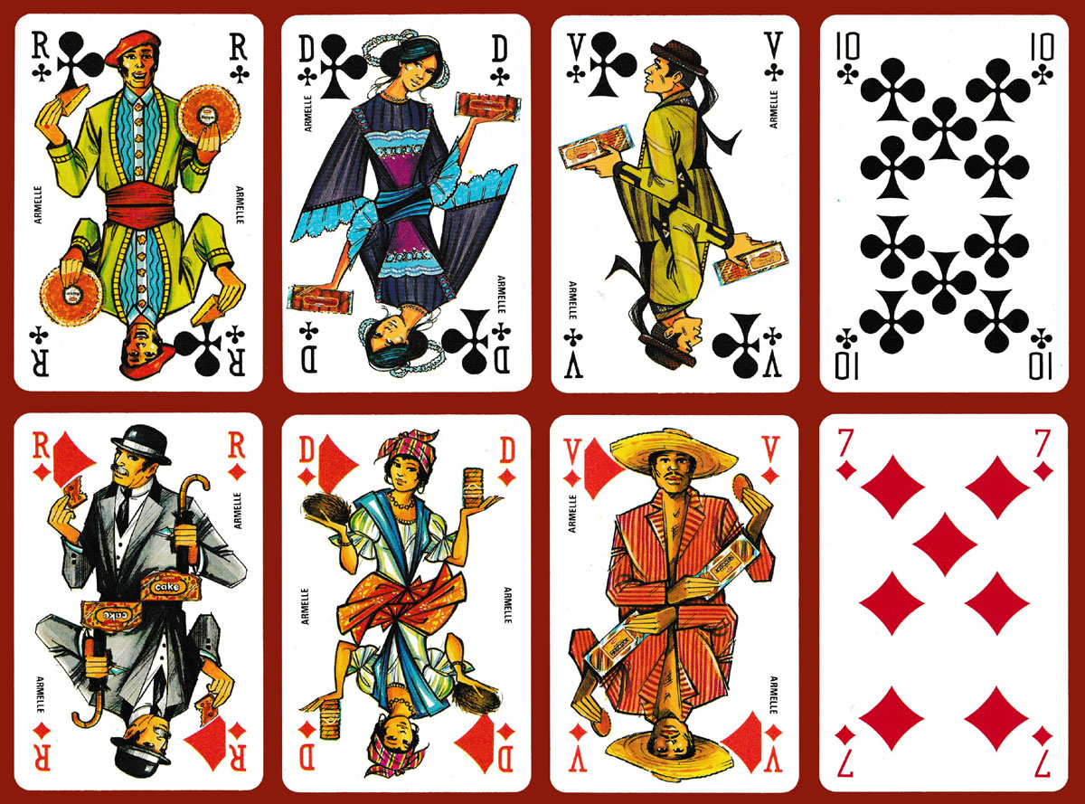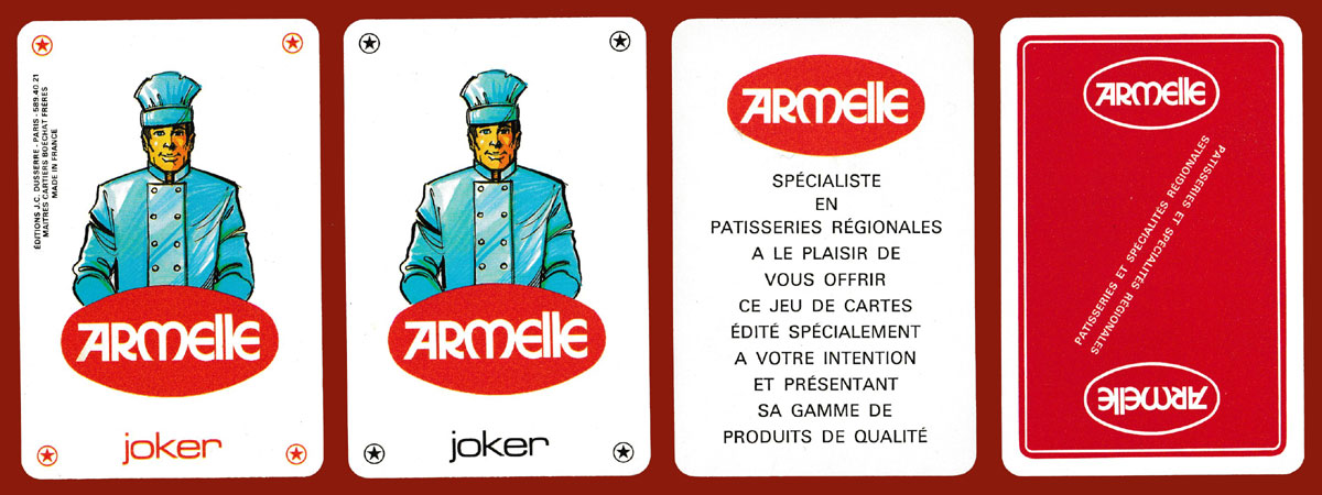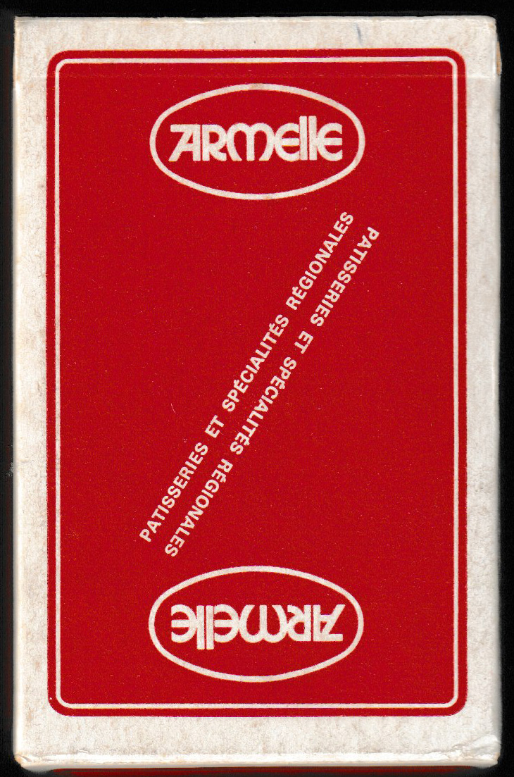 Armelle was a company specialising in the production of regional cakes and biscuits. Their name appears on all 12 of the double-ended court cards which feature figures in national or regional costume holding one of the company’s products. The designs are by James Hodges (1928-2019), in his unmistakable style. The Jokers show a pastry chef; the Aces and numeral cards are plain. The company logo appears on the Jokers, the extra card, the backs and the box►