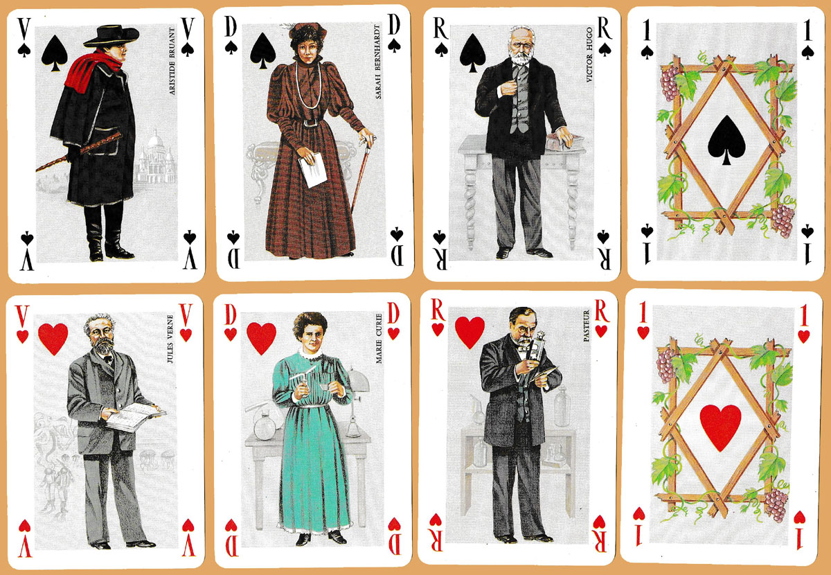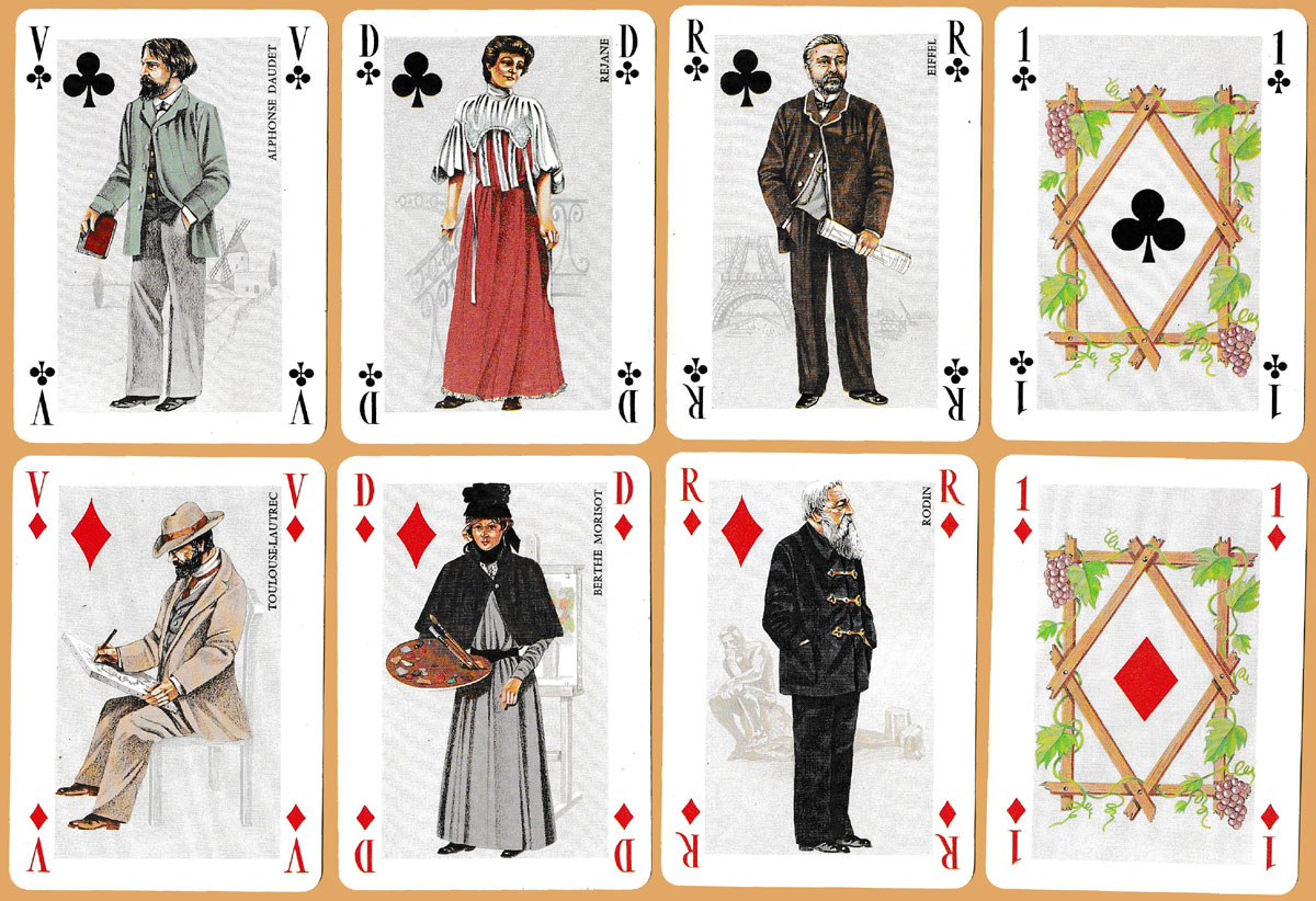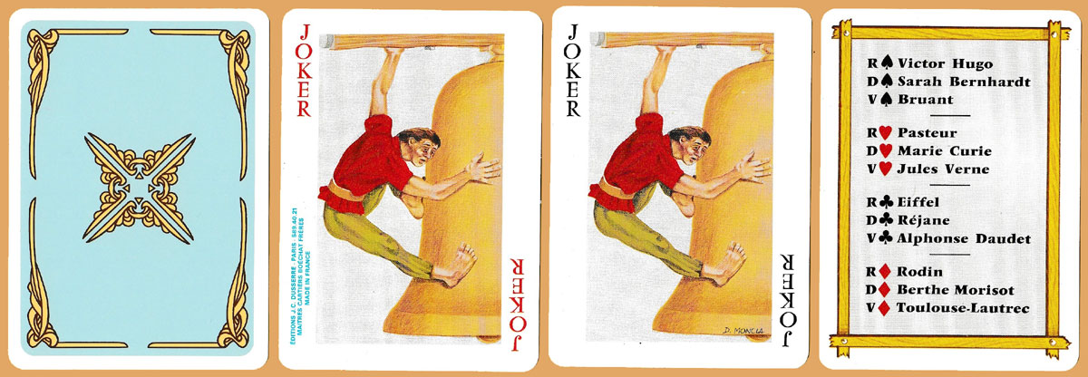 La Belle Epoque was a period of French and European history, usually considered to begin around 1871–1880 and to end with the outbreak of World War I in 1914. This pack, published by J.C. Dusserre, Paris in 1980, presents on the court cards significant individuals from the worlds of art, science and literature of the era who are included in the Grévin [waxwork] Museum in Paris. The pip cards are standard, while the two jokers appear to represent the Victor Hugo’s Hunchback of Notre Dame. See the box►
