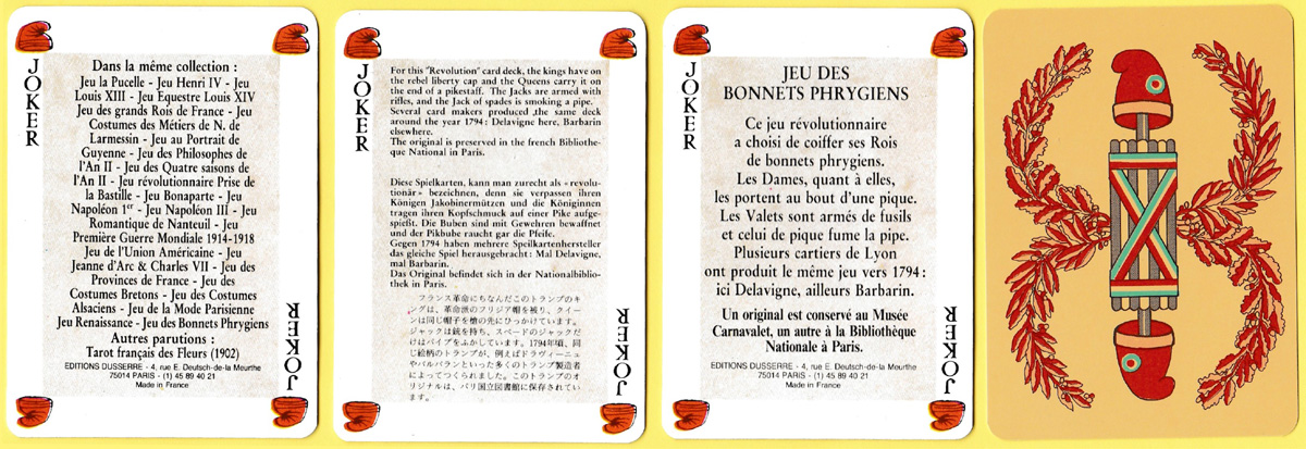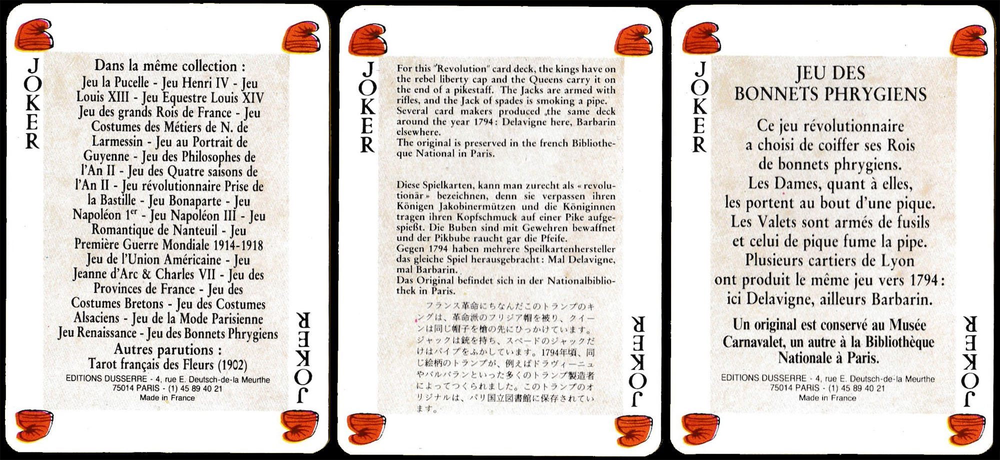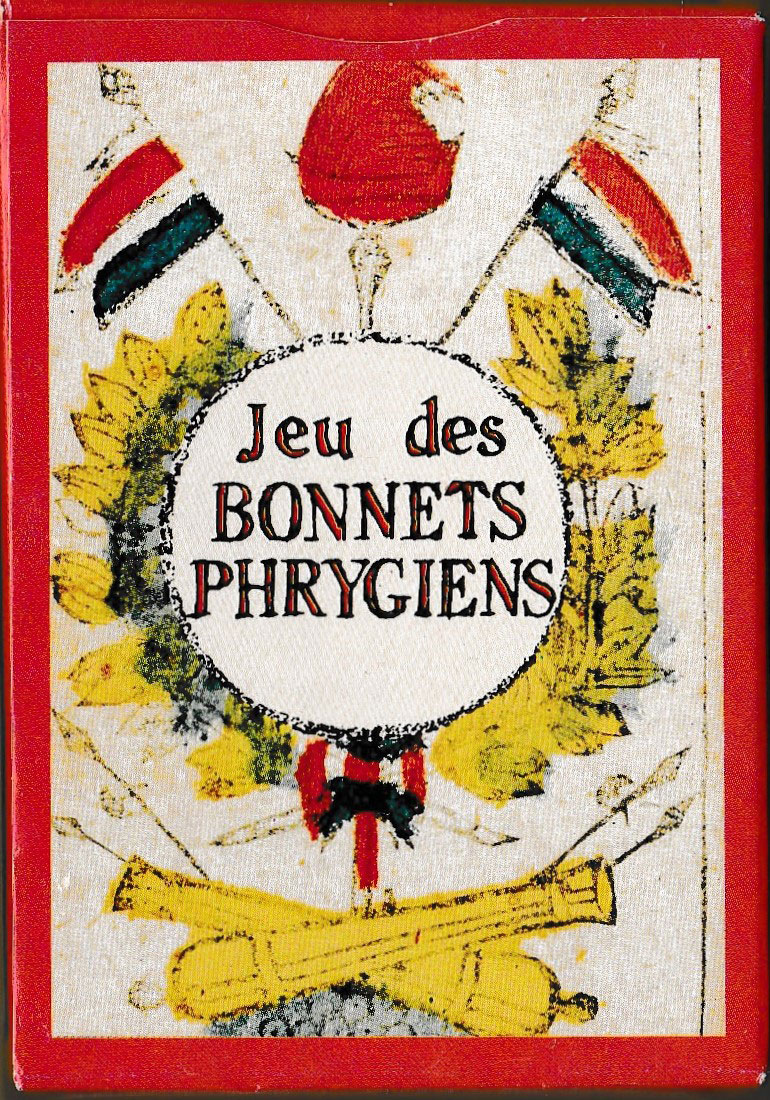 Published by Éditions Dusserre and printed by Boéchat Frères in 1988, this is a reproduction of the 1794 pack held in the Bibliothèque Nationale in Paris. (It is also held in the Carnavalet-History of Paris Museum, Musée Carnavalet). The title relates to the Phrygian cap or bonnet (or liberty cap). This is a soft conical cap, usually red in colour, with the apex bent over, and was worn in the time of the French revolution and which came to signify freedom and the pursuit of liberty.