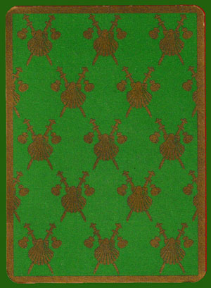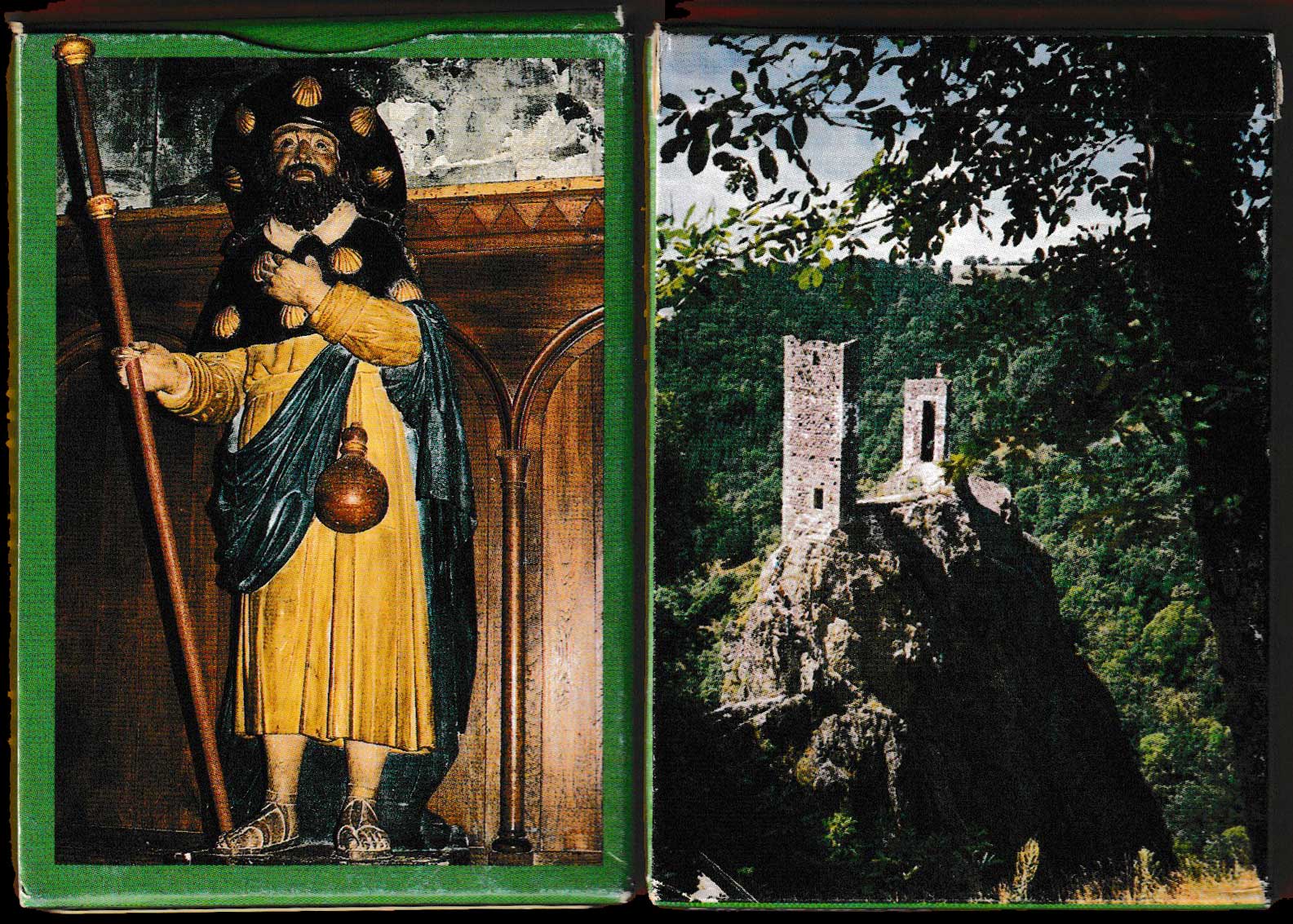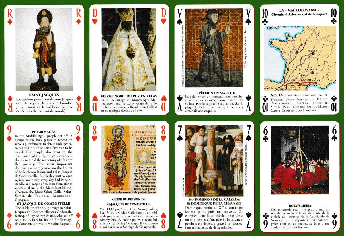 There are four principal routes to Compostela starting in France – from Tours, Vézelay, Le Puy-en-Velay, and Arles. These routes are shown on the 10s and Jokers. Statues of Saint Jacques (St James) are featured on the Kings. The other cards in this fully illustrated pack depict the Virgin Mary, pilgrims and views in colour of famous places along the way, with text in French at the foot of each image. The 9s carry further text in English, French, German and Spanish about the history of the pilgrimages. The back design is made up of scallop shells (the emblem of Santiago carried by all pilgrims) in gold against a green or blue background. See the box►