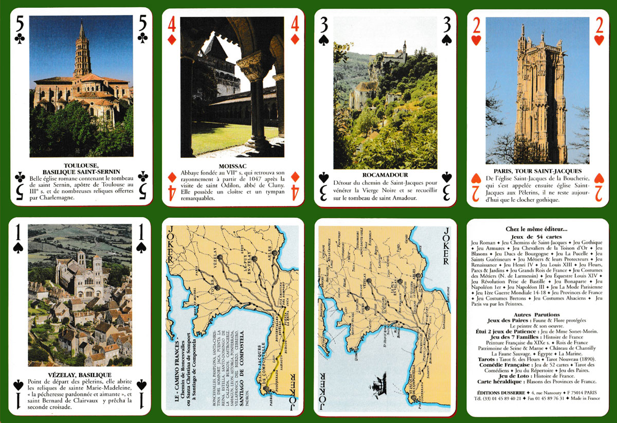 Above: Les Chemins de Saint-Jacques published by Editions Dusserre, Paris, France, c2000. Printed in France. 52 cards + 2 Jokers + 1 extra card in tuck box. Size: 63 x 88 mm. The back design is made up of scallop shells (the emblem of Santiago carried by all pilgrims) in gold against a green or blue background.