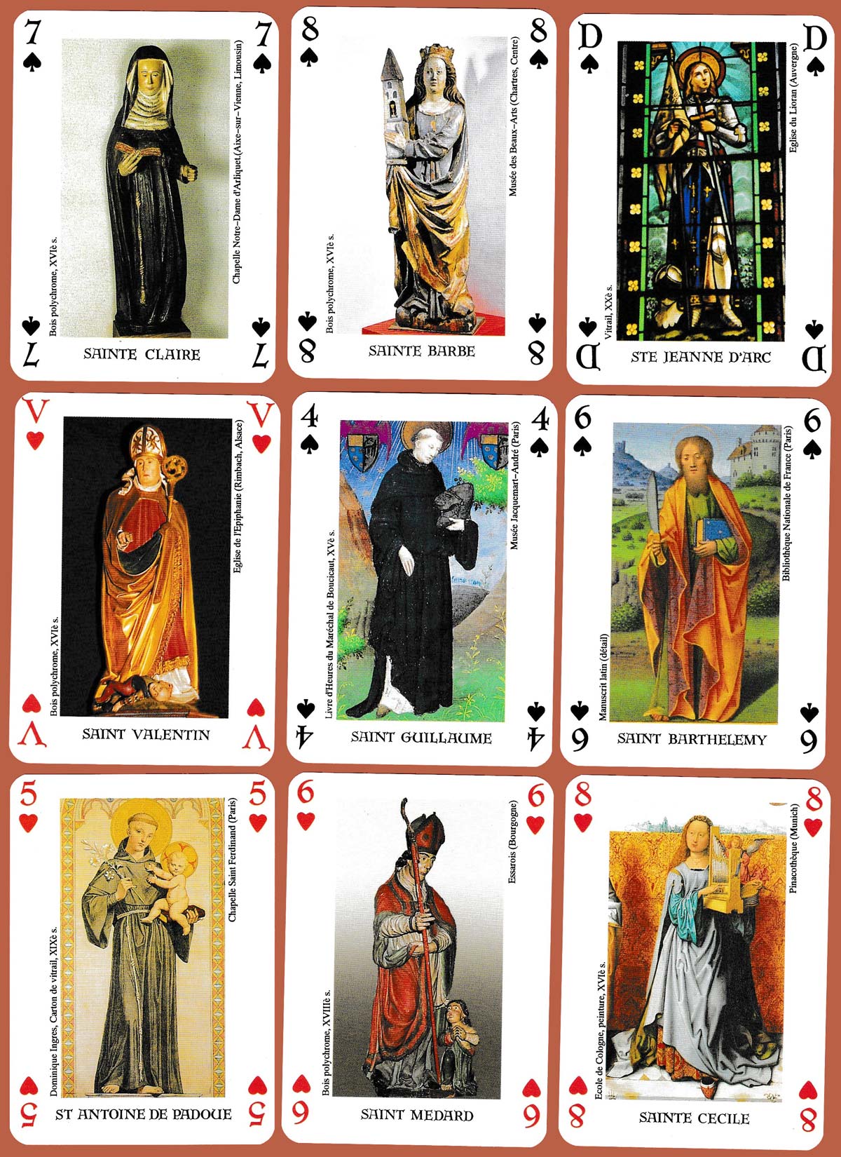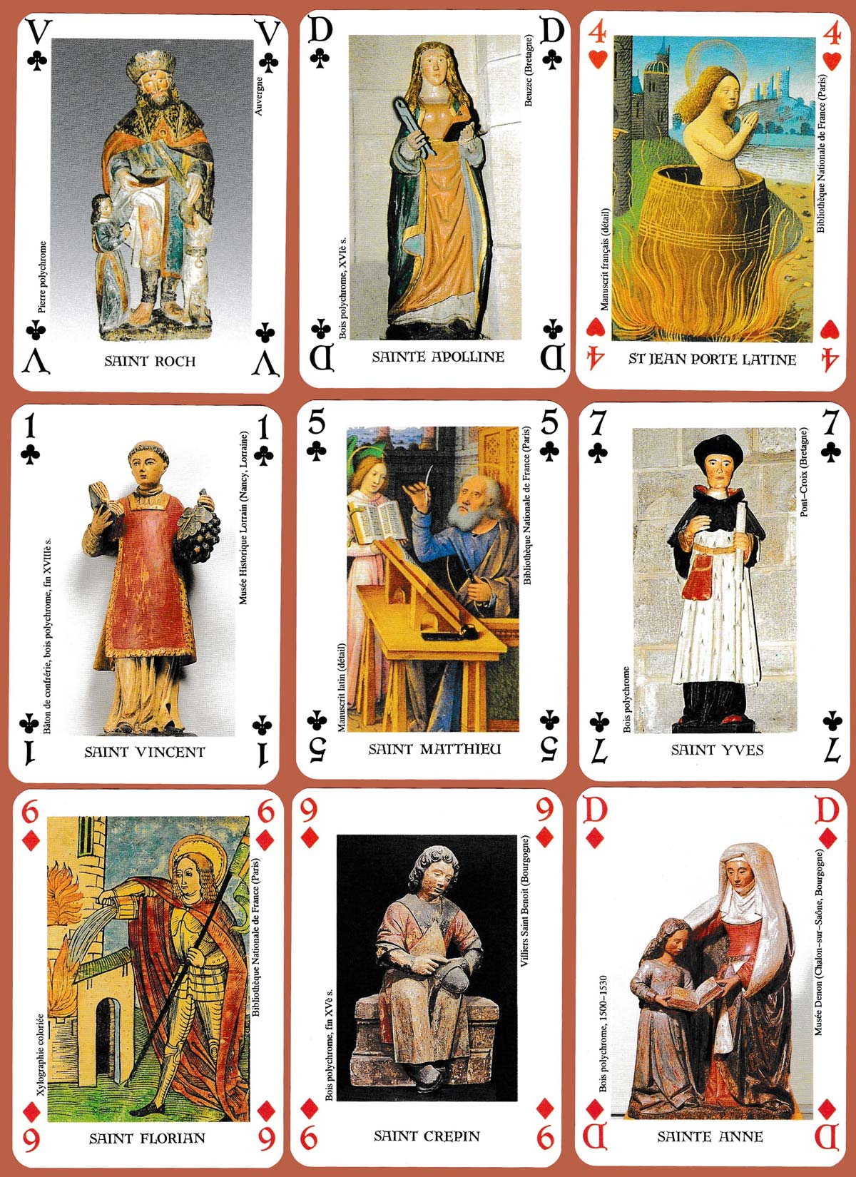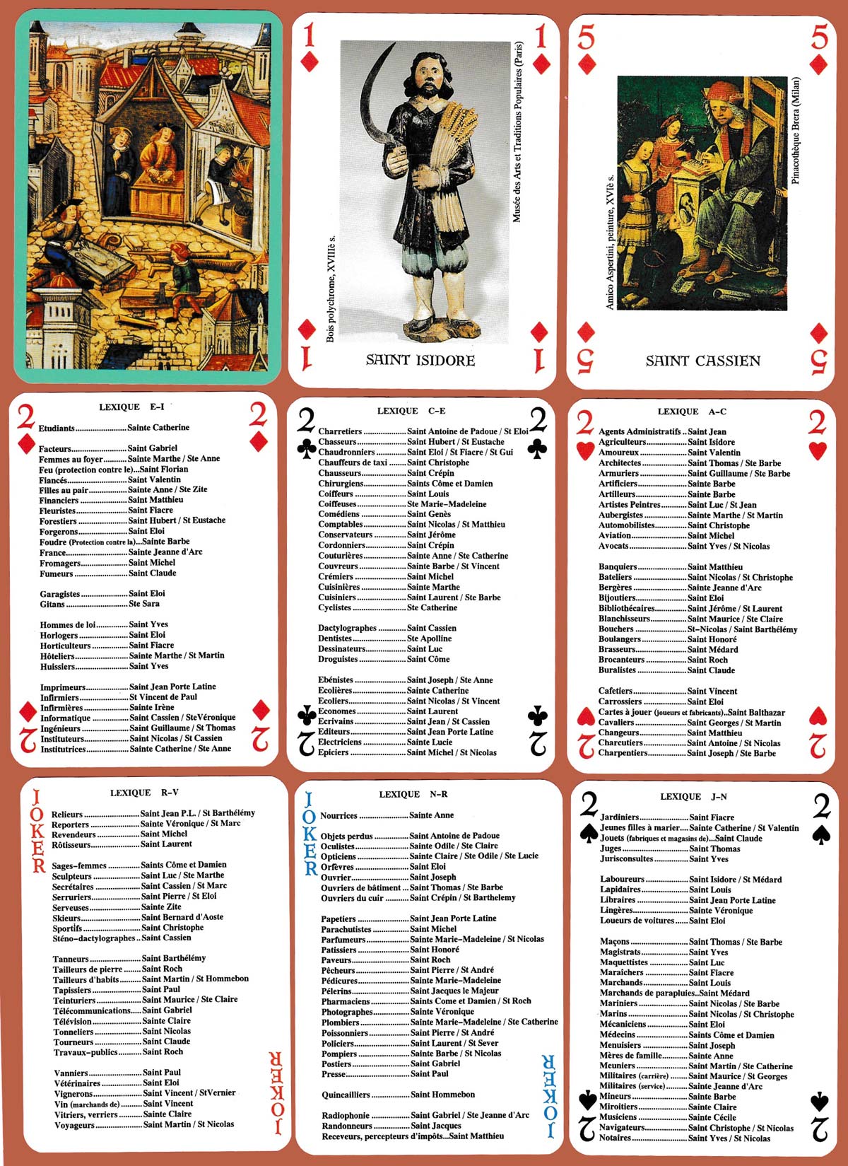 This pack, published by Editions Dusserre, c. 1995 displays photographs, paintings or polychrome wood sculptures of saints on 48 of the 54 cards. The deuces and the two jokers list over 170 different trades or professions with the name (or names) of their patron saint(s). Several have more than one protector, depending on their town or region. So, Saint Balthazar is the patron saint of card players and manufacturers, Saint Jean Porte Latine of printers and booksellers. Clockmakers, florists, bankers, umbrella manufacturers, firefighters, tanners, wine merchants, clockmakers, and many others are listed. See the box►