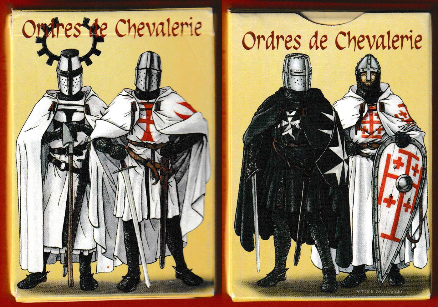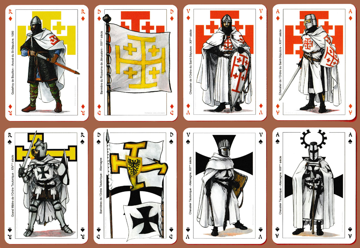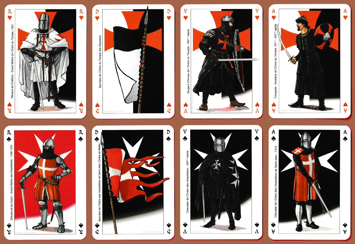 The orders of chivalry represented here all began life during the Crusades, 1097-1291. Grand Masters, knights and others are shown on the Kings and Jacks. As all knights were male, banners are displayed in place of the Queens. The orders depicted on the four suits are the Knights Templar (H), the Knights Hospitaller (C), the Order of the Holy Sepulchre (D), and the Teutonic Knights (S). Their respective symbols appear in place of the pips on the numeral cards and in the background of each court card. The two Jokers represent the Order of Saint Lazarus and the Order of Santiago. The artists’s name (Patrick Dallanégra) appears very faintly and discreetly on all the court cards, Aces and Jokers. The four main suit symbols also make up the back design. See the box►
