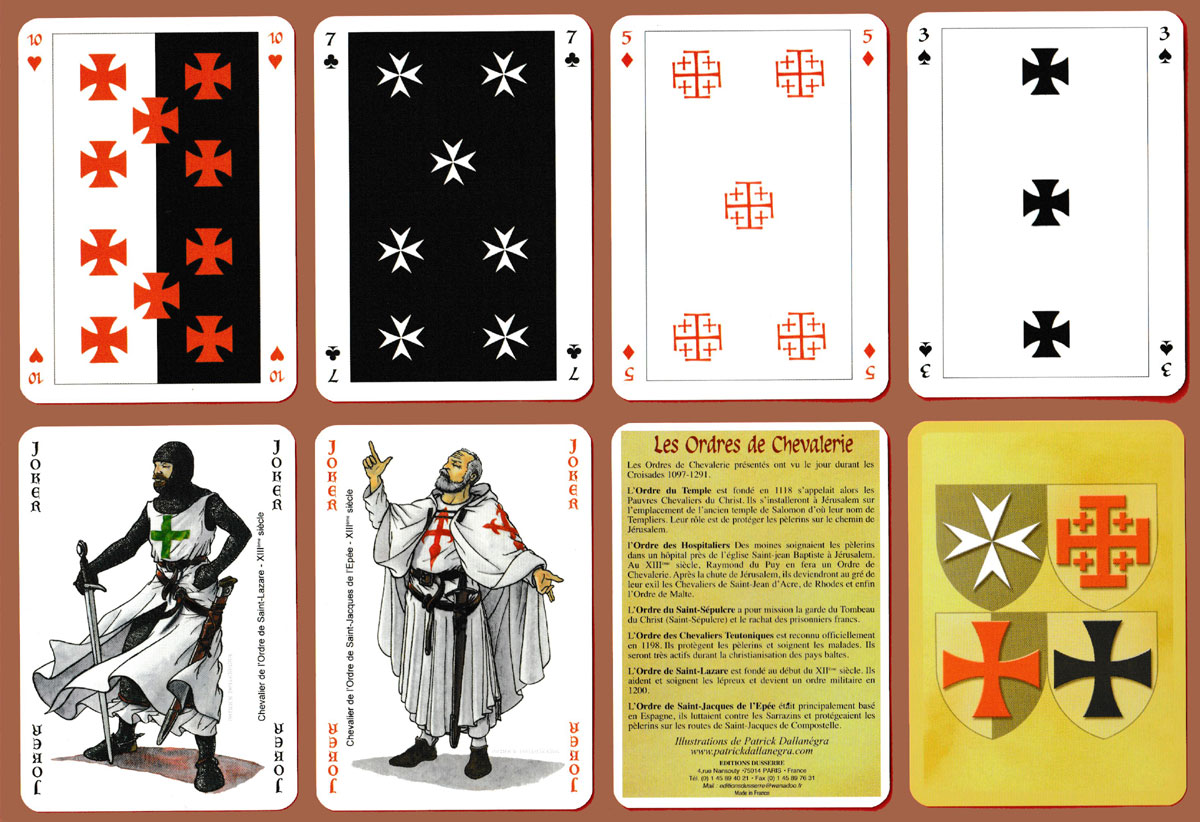 Above: Les Ordres de Chevalerie playing cards published by Editions Dusserre, Paris, France, 2006. Cards made in France. 52 cards + 2 Jokers + 1 extra card in tuck box. Size: 63 x 88 mm.