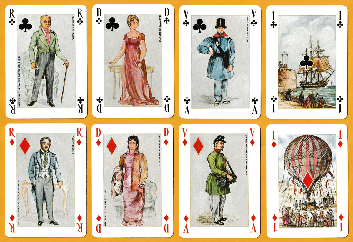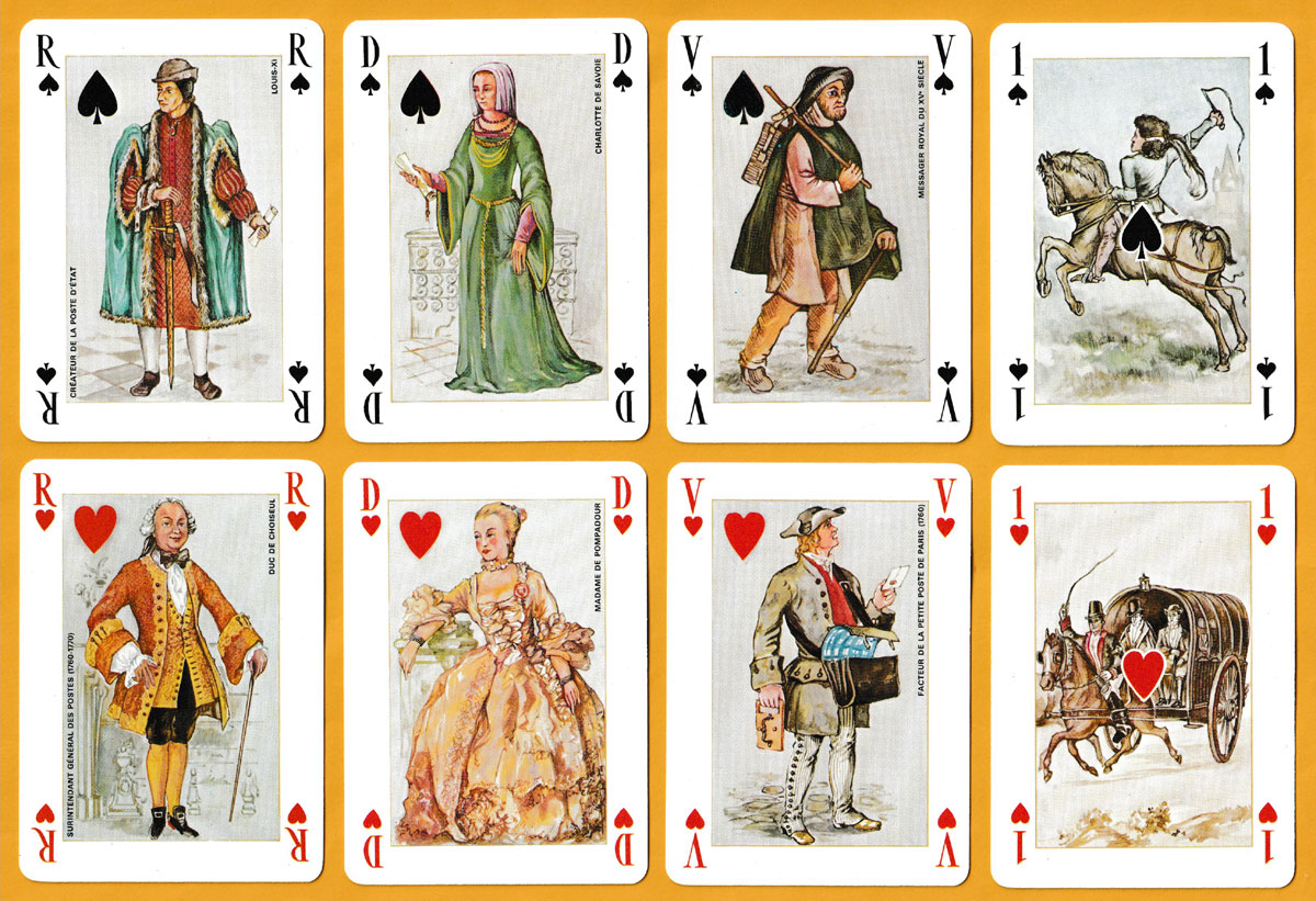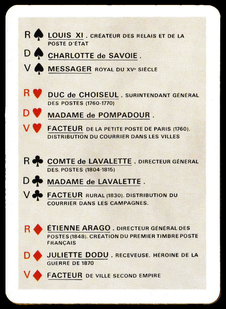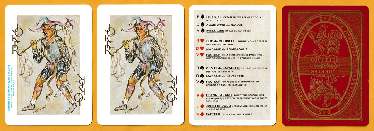 Arguably, the more interesting of Henri Simoni’s designs for this pack appear on the jacks (different postmen and postal messengers) and the aces (different means of transporting mail, including balloon post). The kings represent directors of postal services together with the creator of the first system of postal relays (relais de poste) in France, Louis XI (KS). The queens are portrayed with elegance as historically significant women linked to communication and related societal roles of their times. The Postal Museum in Paris provided the documents from which the designs were taken. Simoni’s name appears at the foot of each Joker. The extra card provides a who’s who of the characters on the court cards. The back design is adapted from the badge of the mail section of the French despatch service (Service des dépêches, i.e., the Post Office), c1850. • See the box