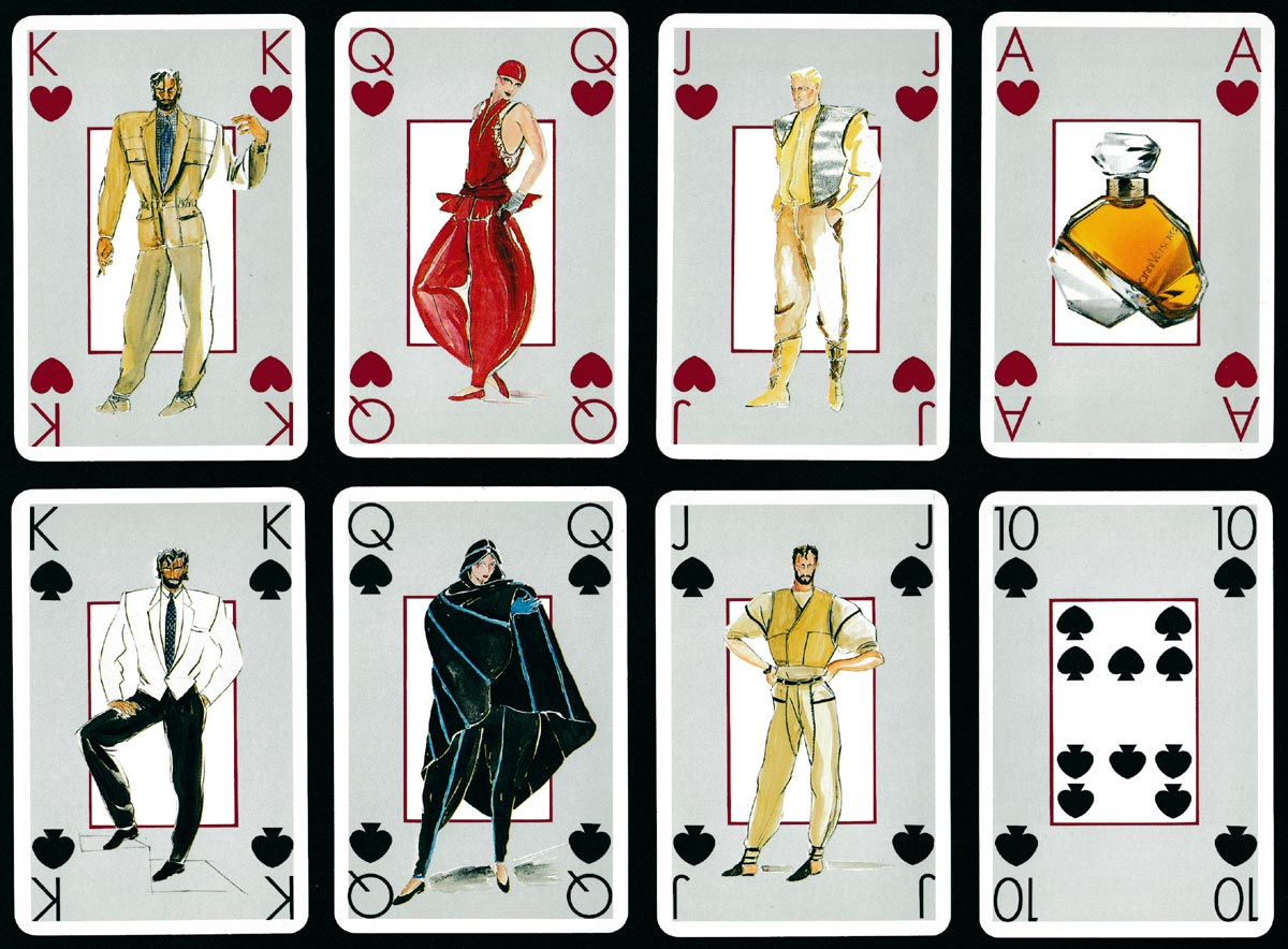 Suitably stylish designs, as befits a world-renowned fashion house. The courts look as if they have jumped straight off the page of the great designer’s sketchbook. Versace started marketing perfume in 1981 so this pack must date from shortly thereafter (and certainly before 1985). The same perfume bottle is shown on all the Aces. The Joker also holds a bottle of perfume. Grey backgrounds throughout. The classy look is maintained on the pip cards and on the navy blue and gold box►