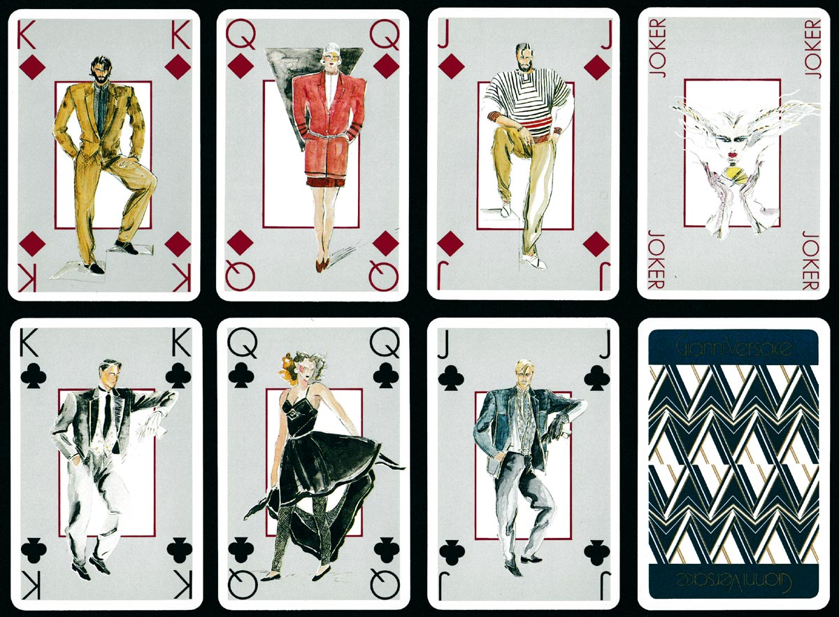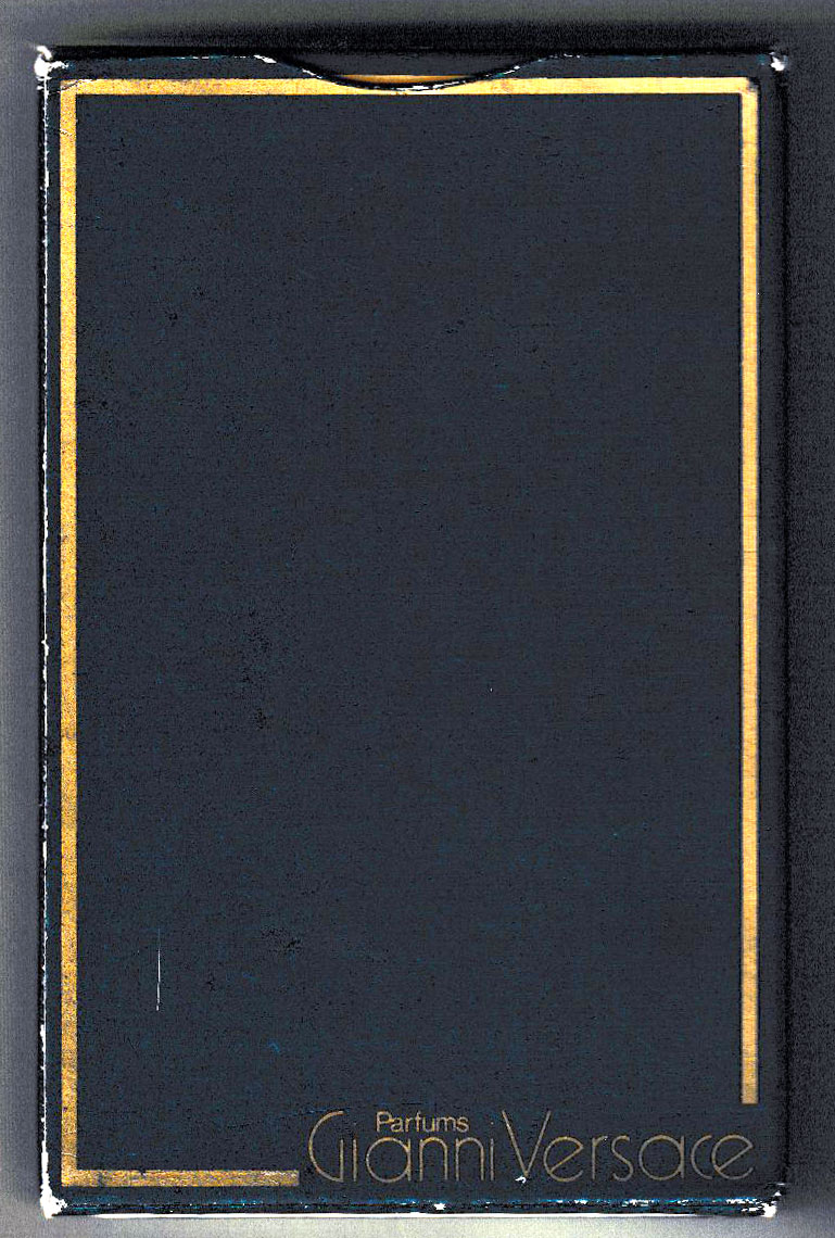 Above: advertising pack for Gianni Versace perfumes printed by Héron/Boéchat and published by Editions Dusserre, Paris, France, c.1982. 52 cards + 3 (identical) Jokers in tuck box. Size: 57 x 87 mm.