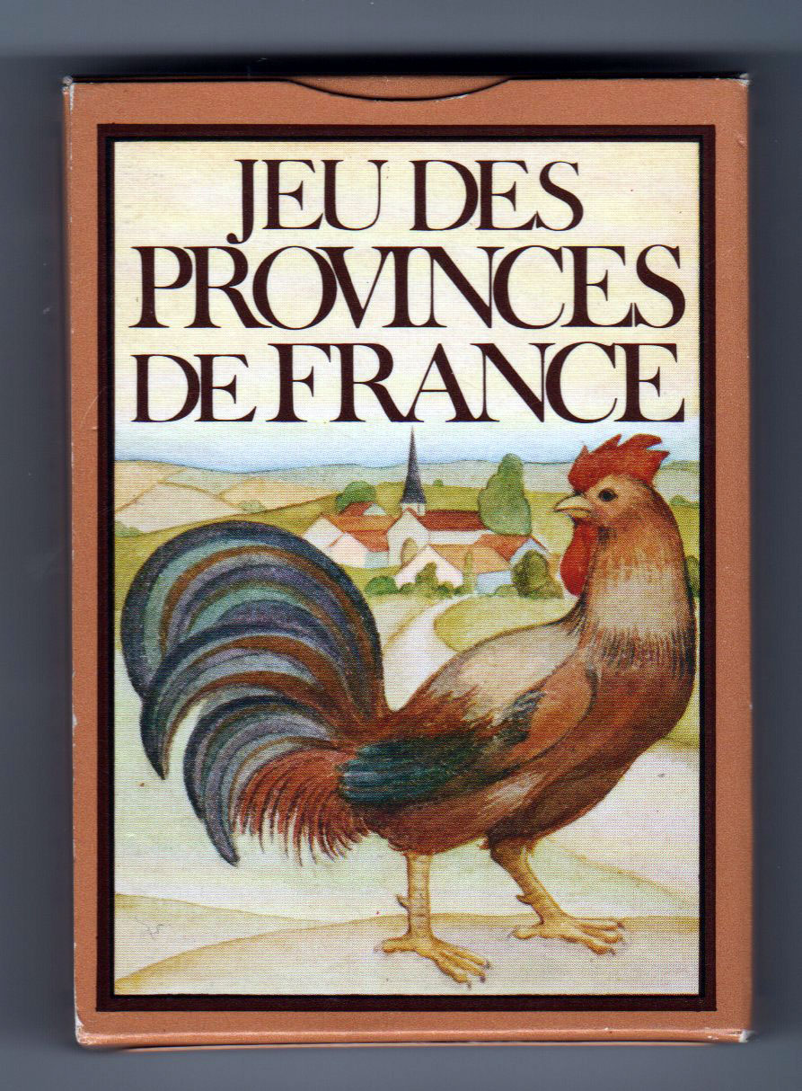 Jeu des Provinces de France published by Éditions Dusserre, printed by Boéchat Frères, 1979. The aces, court cards and jokers feature designs by Gilbert Pinon depicting people in traditional costumes from different provinces. See the Box►