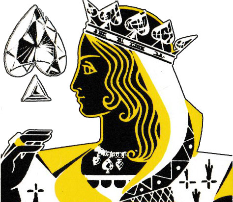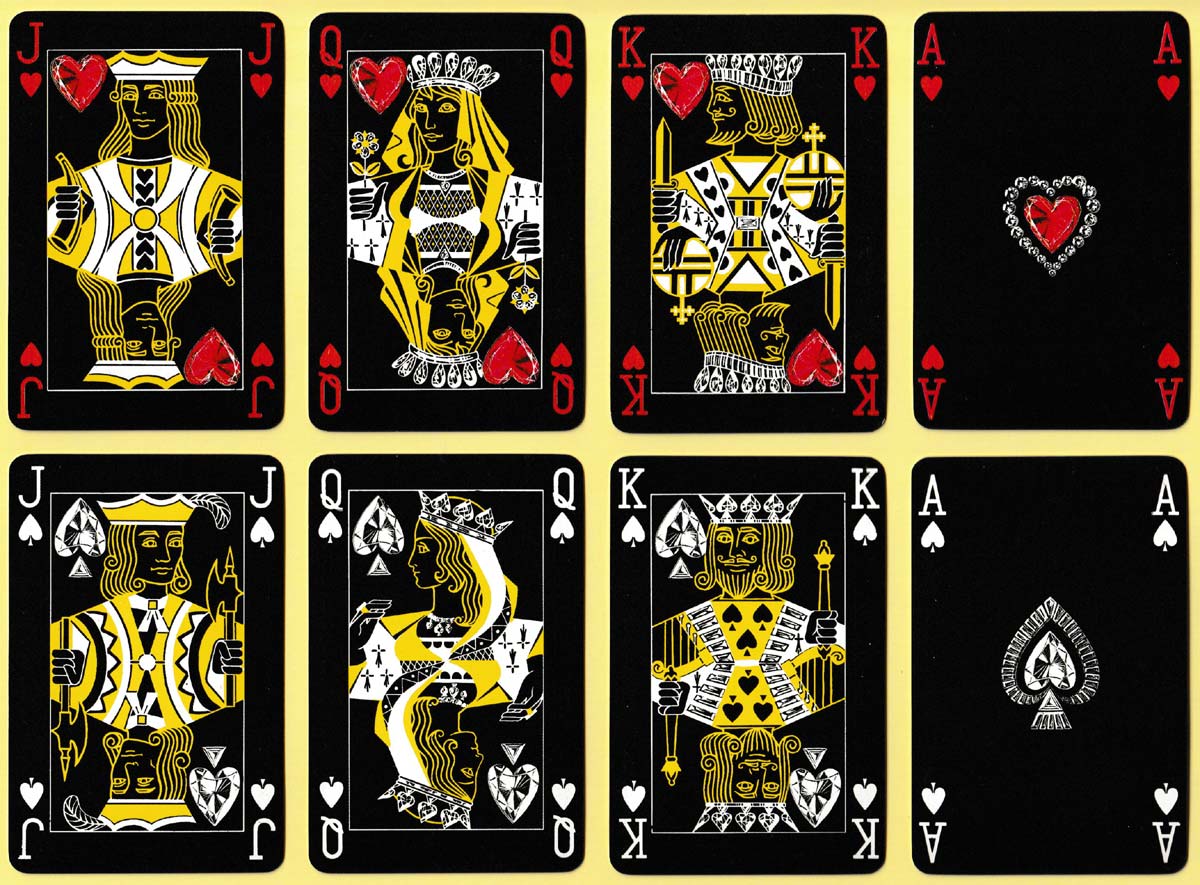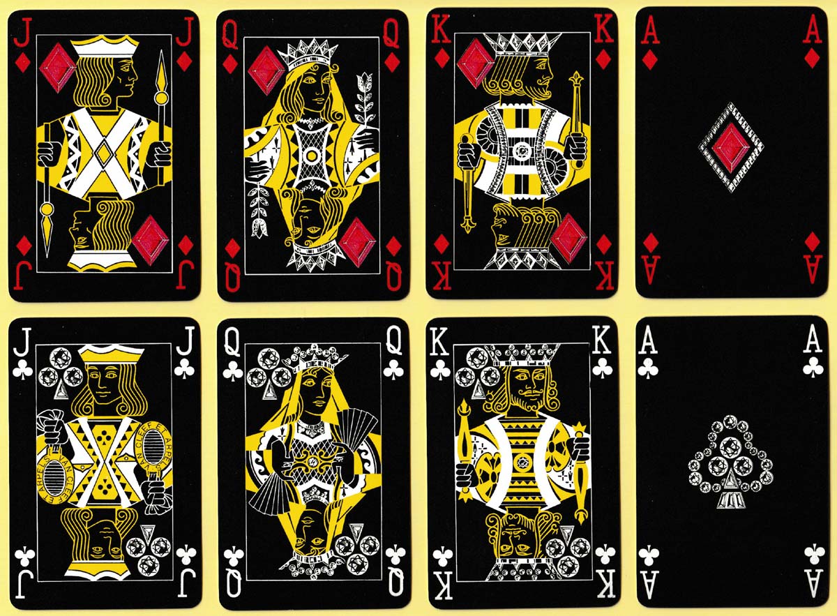 Packs with black backgrounds often look stunning, this one more so than most. Add heavily gilded edges and you have a luxury item for a luxury jewellery company. The red suits look fine against their black backgrounds but the black suits have necessarily had to be changed to white. The effect is completed by the addition of yellow on all the court cards and Jokers (perhaps meant to look like gold). The pips have been faceted to resemble precious gemstones. The Jokers hold octagonal plaques depicting the Place Vendome in Paris where the VCA flagship store has been located since 1906. The signature of the designer, Henri Simoni, appears at the foot of the red Joker. According to the extra card, the pack was offered to customers of VCA’s boutique in Geneva, Switzerland.