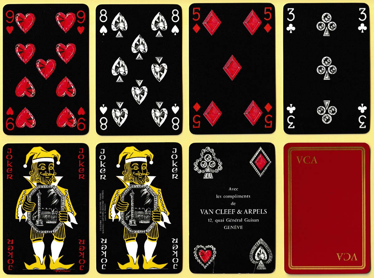 Above: Promotional pack created for Van Cleef & Arpels’ boutique in Geneva, Switzerland printed by Maitres Cartiers Boéchat Frères, and published by Editions J.C. Dusserre, Paris, France, c1980. 52 cards + 2 Jokers + 1 extra card. No box. Size: 57 x 86 mm.