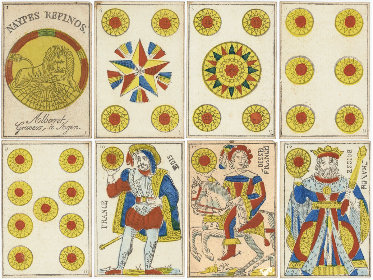 These Spanish-suited cards were engraved by Albaret of Agen, whose name appears on the Ace of coins. New technologies were facilitating a move away from woodblocks, allowing more intricate designs, in this case somewhat eclectic and embellished. The engraver has also added small indices which was another emerging innovation at that time. His connection to Agen, a city in southwestern France, likely signifies either his place of origin or the location where he worked or was based. The deck was subsequently published by Eugène Boisse of Bordeaux, whose name has been hand-stamped onto the cards (not on the original engravings).