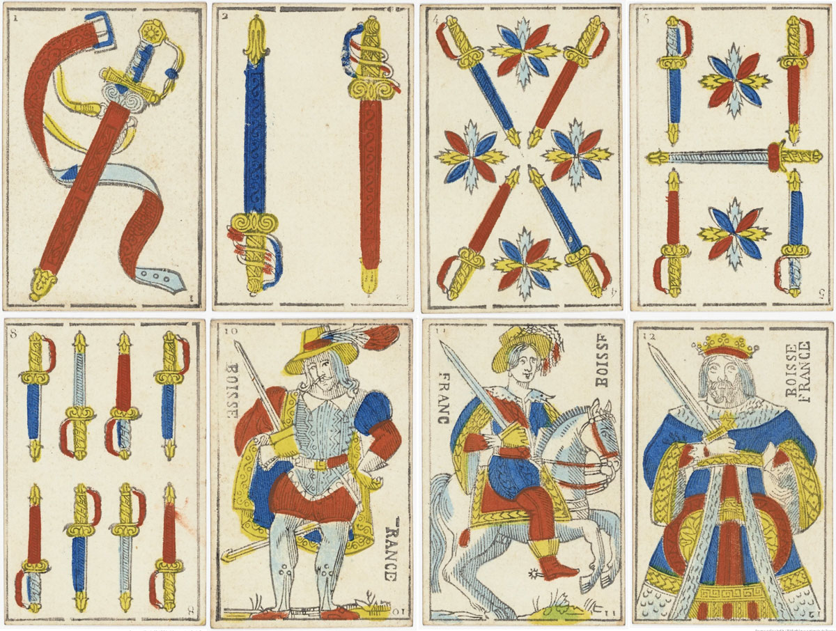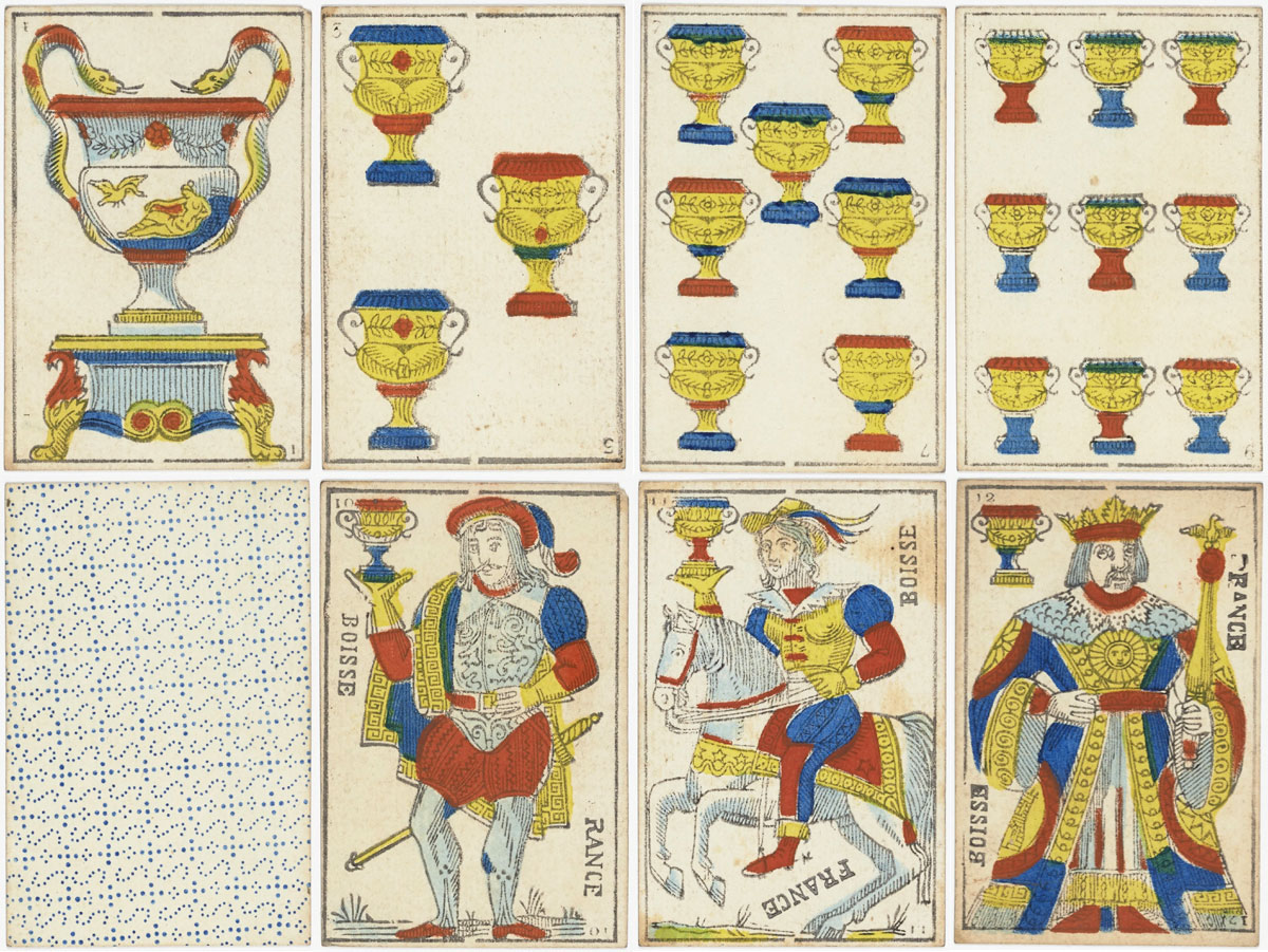 Above: Spanish pattern published by Eugène Boisse, Bordeaux, c.1865. 48 cards, stencil coloured; 8,5 x 5,6 cm. Square corners, small indices, backs with blue dotted decoration. Bibliothèque nationale de France • Jeu d'aluette, Albaret, graveur, à Agen►