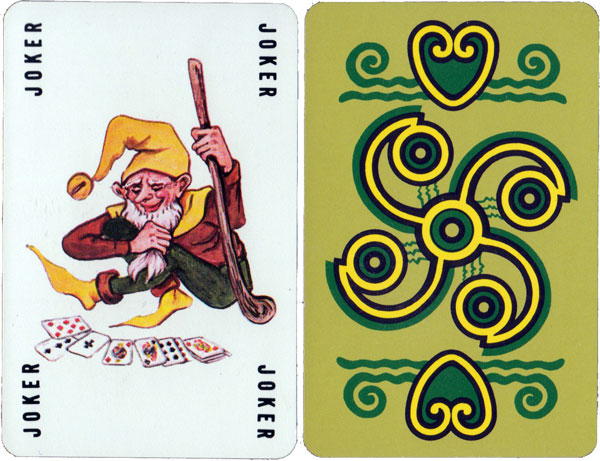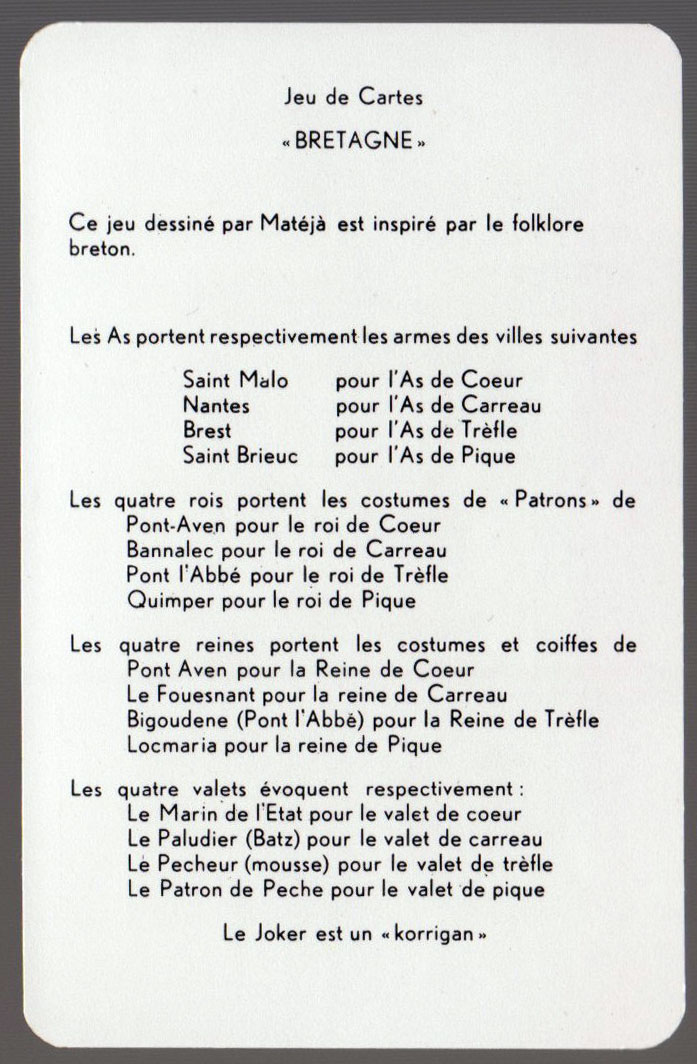 Jeu de Cartes “Bretagne” designed by Matéjà (Marie-Therese Jallon) featuring Breton folklore with celtic decorative motifs on the back. In Breton folklore, a Korrigan (Joker card, right) is a leprechaun or dwarf-like spirit who, on account of magical powers, is sometimes believed to be evil. The courts wear idealised traditional costumes from different parts of Brittany to convey their cultural identity. An extra card in the pack names the four aces and court cards→