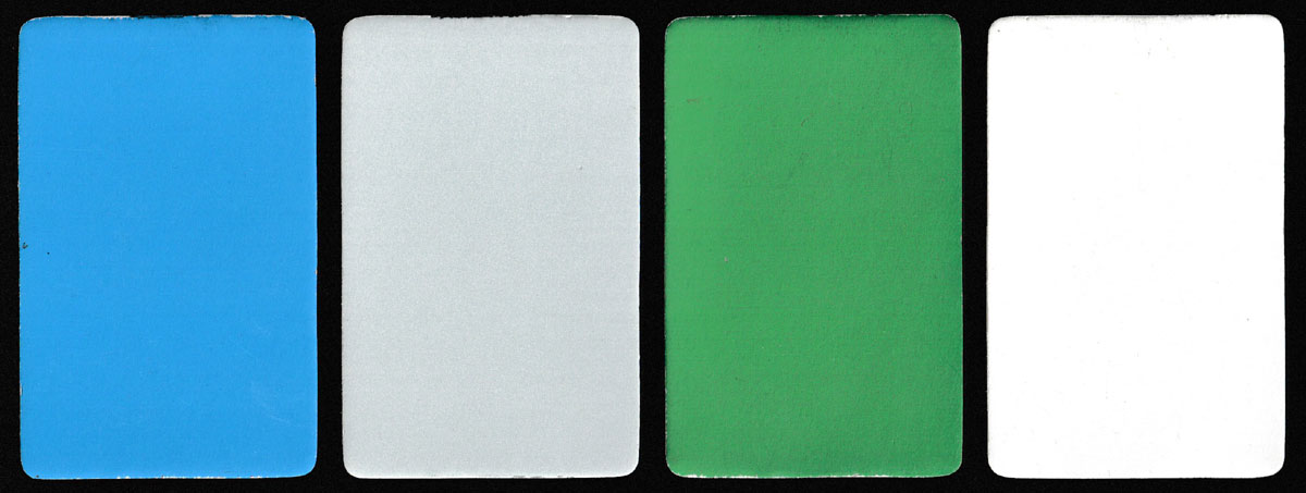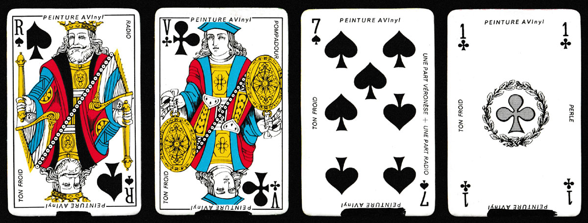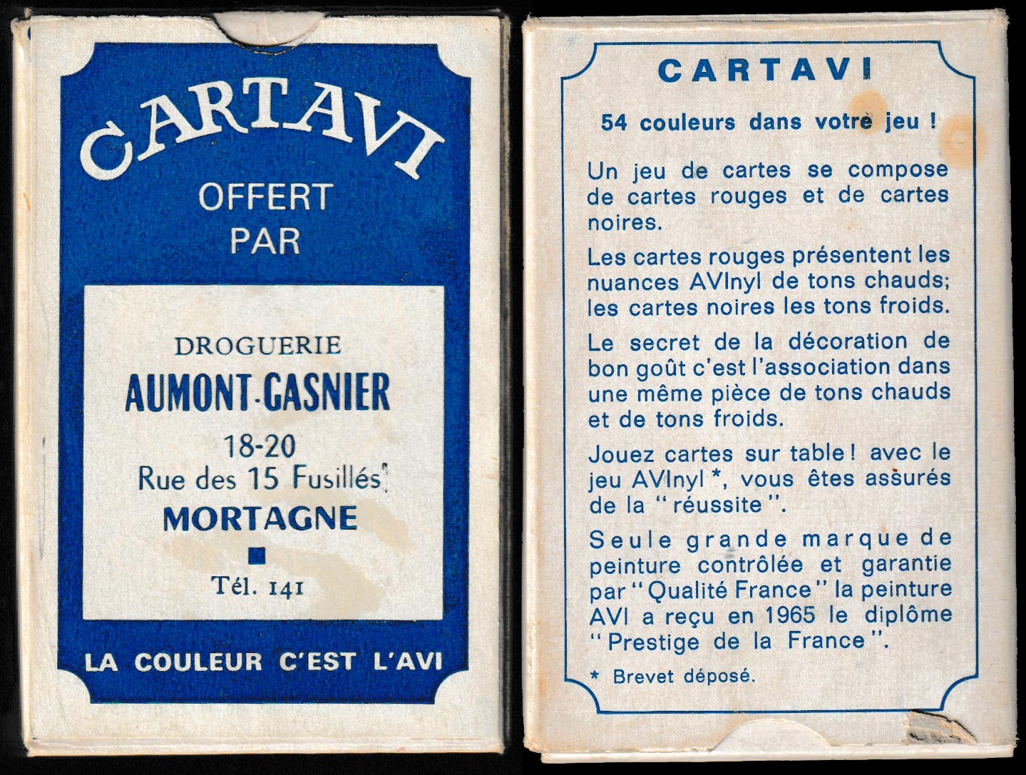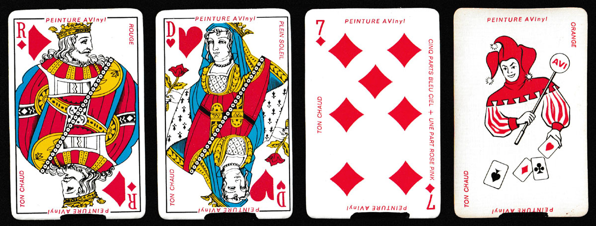 Have you ever wanted to try out a new paint colour but not wanted to use actual paint? Well, here’s the answer! Take a pack of cards like this one where every back represents a different colour and make your choice. The principal colours are on the backs of the (Paris pattern) courts, with more subtle shades on the backs of the pip cards. AVInyl shades with warm tones are on the red suits, while shades with colder tones are on the black suits. Each of the colours has a matt finish. As is usual with French advertising packs (especially of the 1950s to the 1970s), there is a blank space on one side of the box where the name of a local supplier could be inserted, in this case a hardware business in Mortagne in the Orne department in Normandy. See the box►