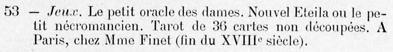 Above: entry 53 from “Catalogue de plusieurs collections d'estampes des écoles française et anglaise du XVIIIe siècle”, published in Paris, 1898, which details an uncut sheet of these 36 cards titled “Le petit oracle des dames, Nouvel Eteila ou le petit nécromancien” with the incorrect spelling of Etteilla's name. Source gallica.bnf.fr / Bibliothèque nationale de France • Catalogue de plusieurs collections d'estampes des écoles française et anglaise du XVIIIe siècle►