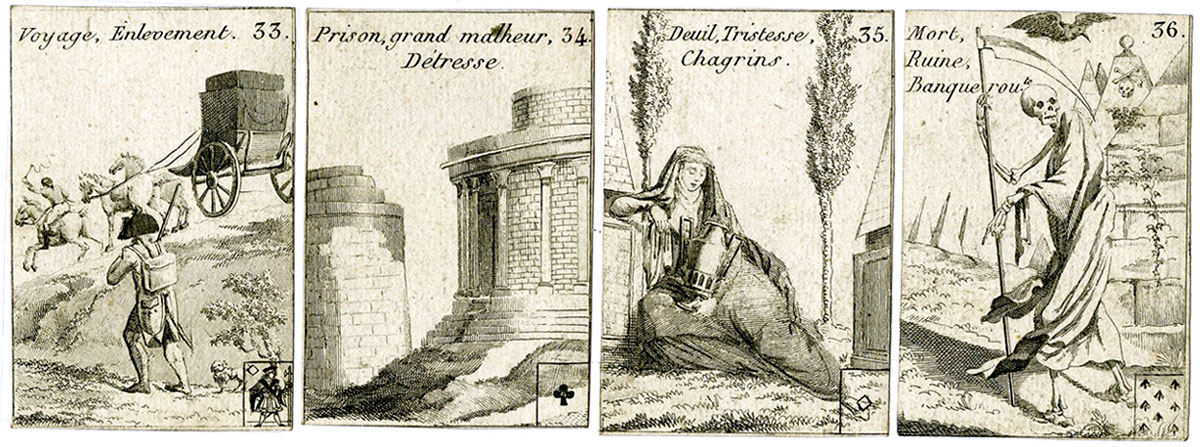 Above: anonymous cartomancy cards, 36 cards, uncoloured, France, originally late 18th century but several further editions over time. © The Trustees of the British Museum • Museum number 1896,0501.714.1-36►