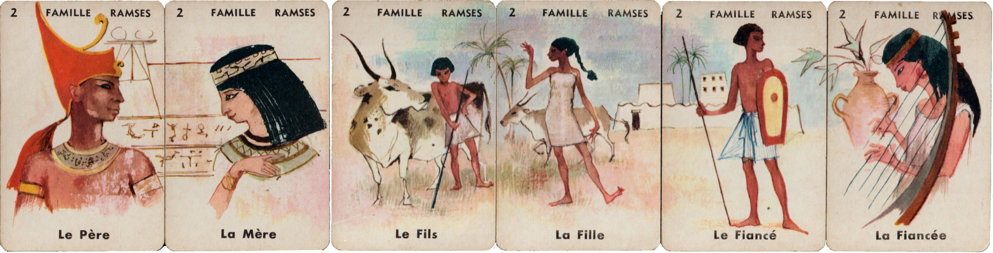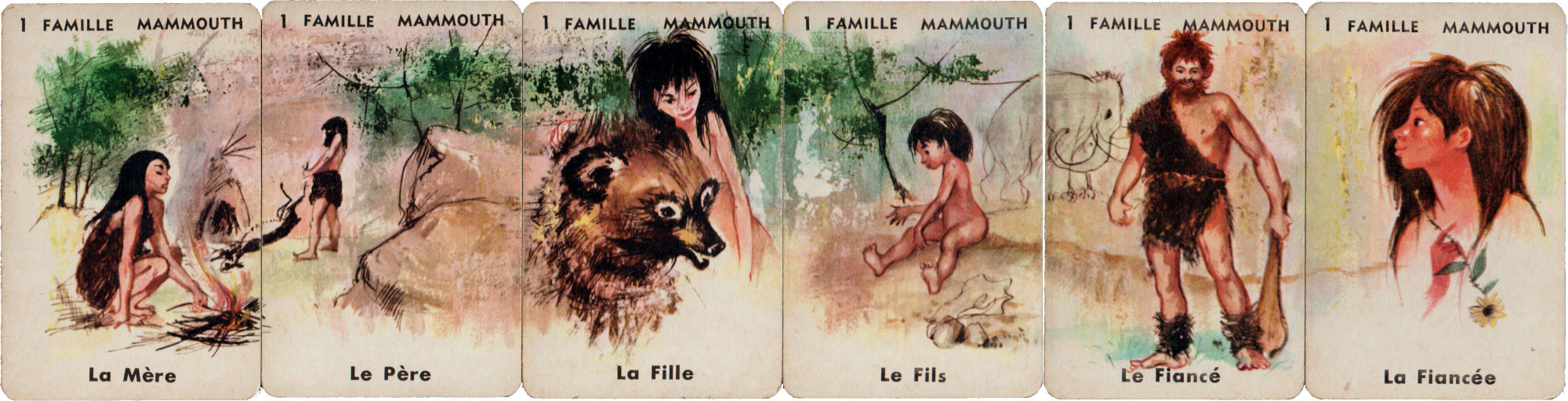 Paul Durand (1925-1977) was a prolific French artist and illustrator who contributed work to many French newspapers and magazines. He also designed numerous book covers. However, this jeu des 7 familles is thought to be the only card game illustrated by him. The theme is 7 historical periods, from ancient to more modern (Mammouth, Ramses, du Manoir, Poule au Pot, Bien-Aimé, Incroyable, and Charleston). The cards in each set of 6 match up, creating a continuous frieze. Durand’s creations predate those of James Hodges but there are strong similarities in terms of style. One big difference between this and more traditional jeux des 7 familles is the inclusion of a Fiancé and a Fiancée (as cards 5 and 6 in the set) in place of the grandparents.