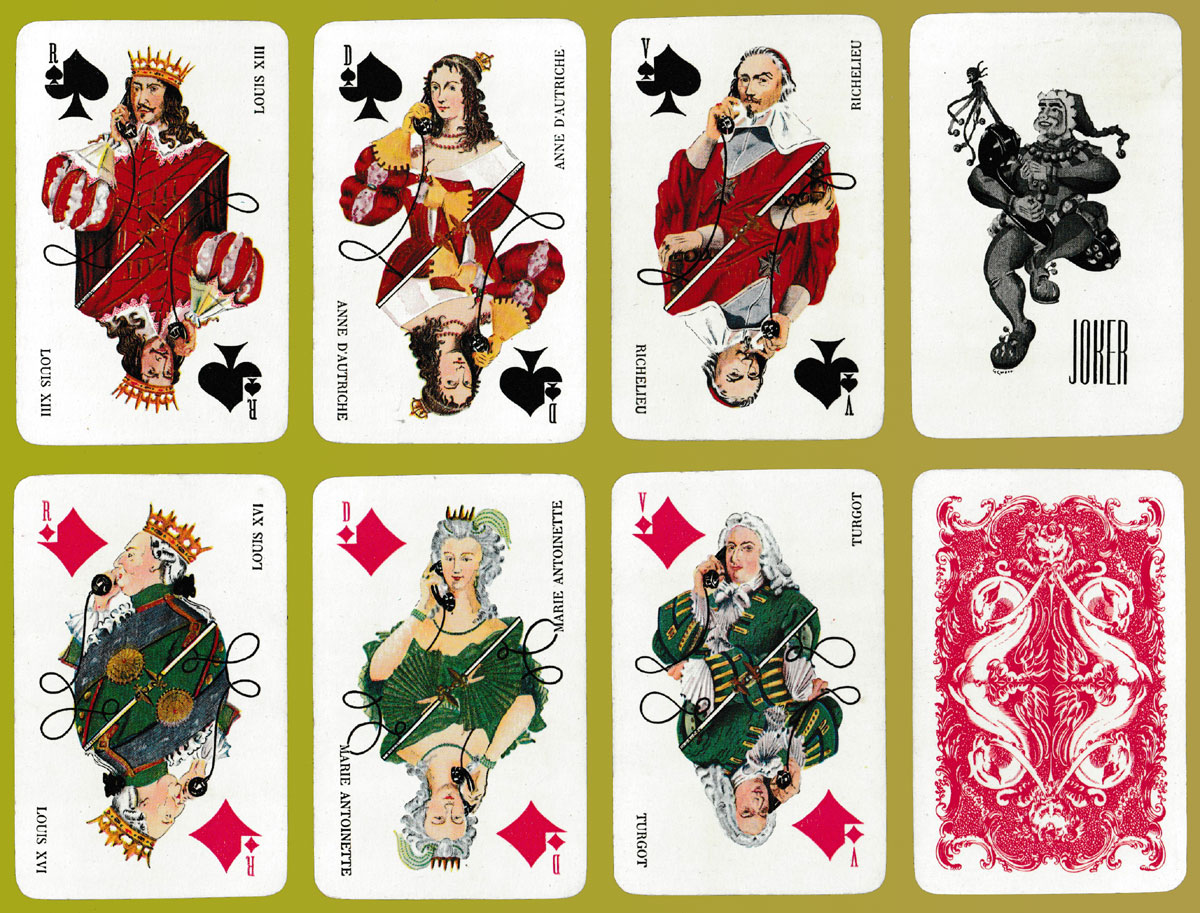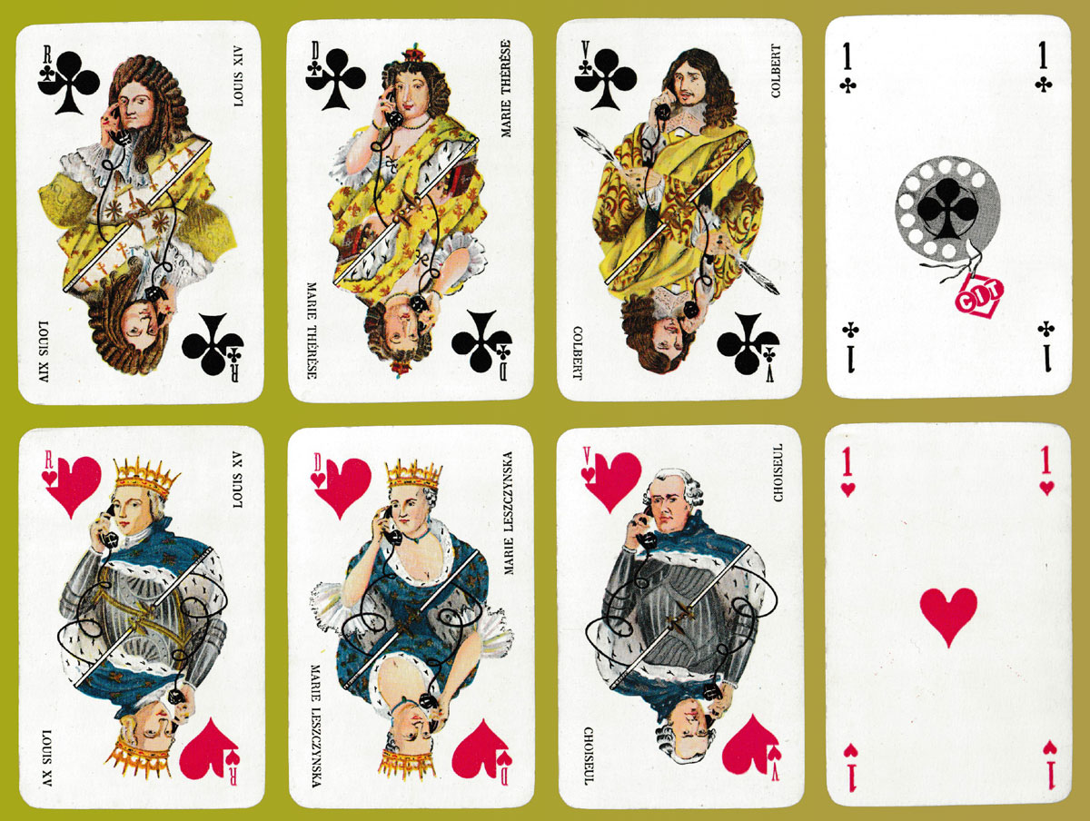 The Compagnie Industrielle des Téléphones was formed in 1946. This pack probably came into being not long after that. The named historical figures on the double-ended court cards are all depicted – somewhat incongruously – on the telephone! A telephone dial is featured in the centre of the Ace of Clubs, with a red and white label attached to it with the initials “CIT” (for Compagnie Industrielle des Téléphones). The company later became part of the Alcatel Group. Strangely, the indices are of different sizes – smaller on the court cards and larger on the pip cards and Aces. What could be the designer’s name appears under the right foot of the Joker but it is too small to decipher. The cards have a glossy finish.