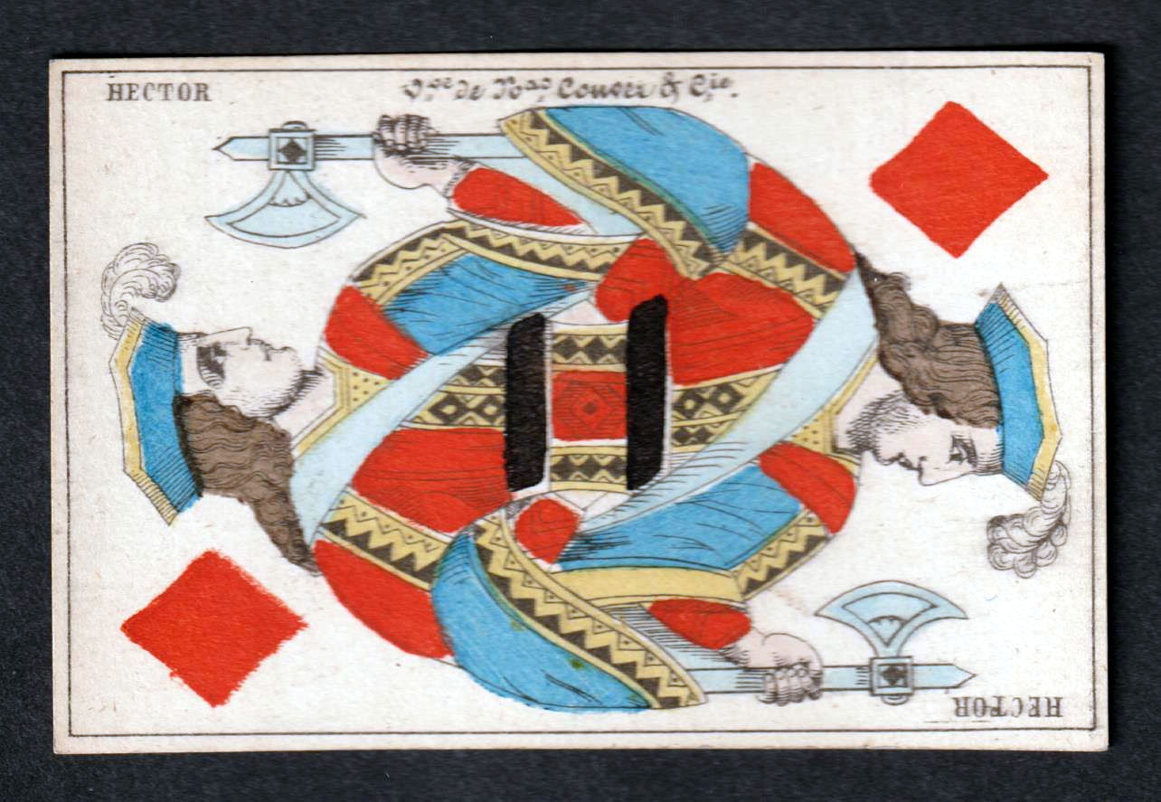 Nowadays, we associate the name of Nicolas Conver with the famous version of the Tarot de Marseille which he supposedly engraved in 1760. I say “supposedly” because the Nicolas Conver we are interested in here – possibly no relation of the Nicolas Conver connected with the Tarot dated 1760 – lived from 1784 to 1833 and is recorded as having been active as a cardmaker and merchant in Marseille between 1809 and 1833. When he died, his widow (veuve, shortened to Vve) took over the business and remarried the following year. The business produced French pattern packs such as this one. On the Jack of Diamonds one can read Vve de Nas Conver & Cie. The factory passed to the brothers Levenq in 1857, at which point the name Conver was dropped, so this pack must predate that event.