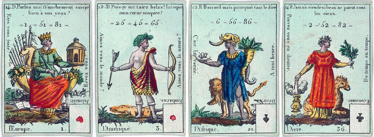 This pack contains 4 allegories of the four continets - Africa, America, Asia & Europe - along with 28 cards representing inhabitants from different countries. The cards have their number and titles at the bottom, while at the tops and down the sides are printed in French fortune-telling questions (D) and responses (R), such as: “Tell me frankly am I good in your eyes?”, “Can I be quiet alas! when my heart sighs?” or “What would you do if I said yes to you?” The answers appear to be found on different cards, perhaps those which turn up next in the reading: “What do you think?”, “It is not for me to answer you”or “Will you be constant?”. A small miniature playing card in the bottom right-hand corner gives additional value to each card. However, the card numbers are not consecutive and run as high as 40, suggesting this is not a complete set (missing 8 cards, or the 8 green-tinted cards from the ‘Costumes des Peuples Étrangers’ (below) belonged with this set).