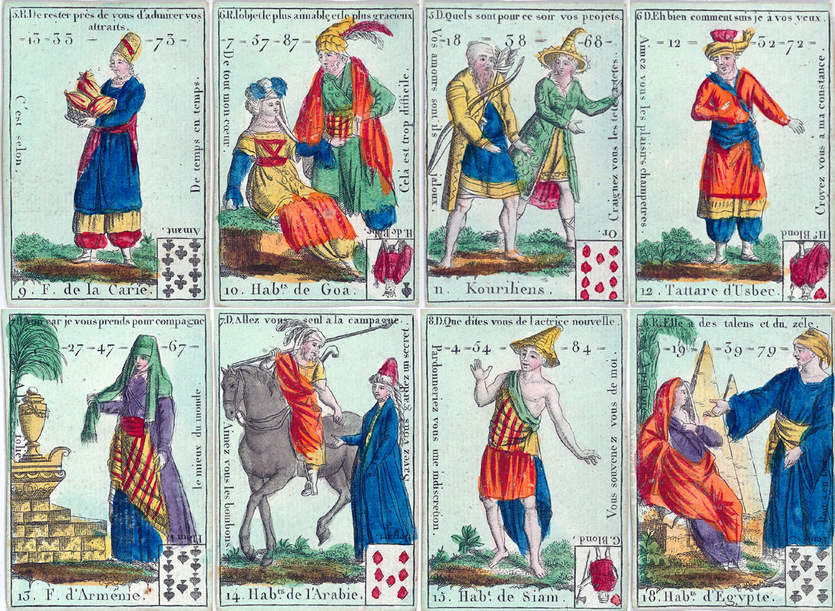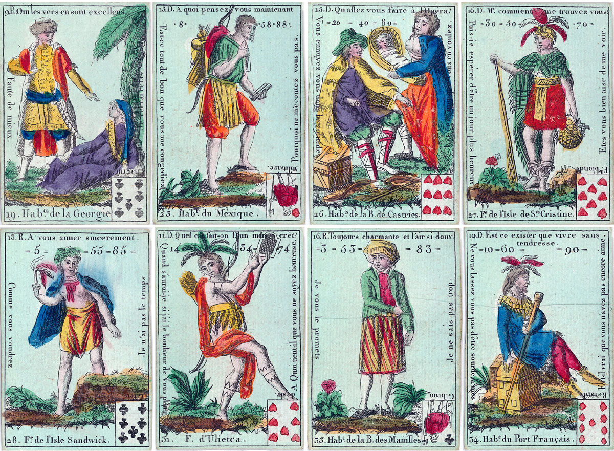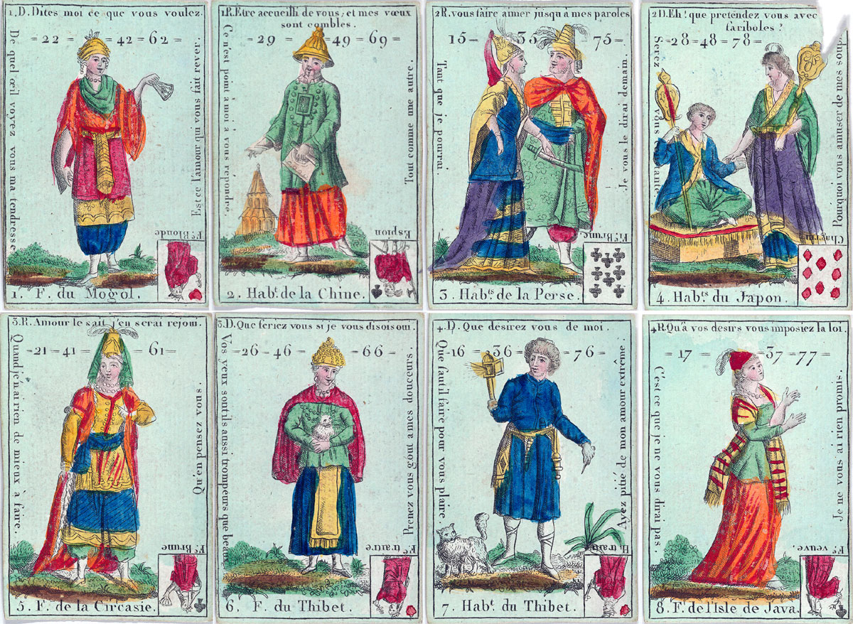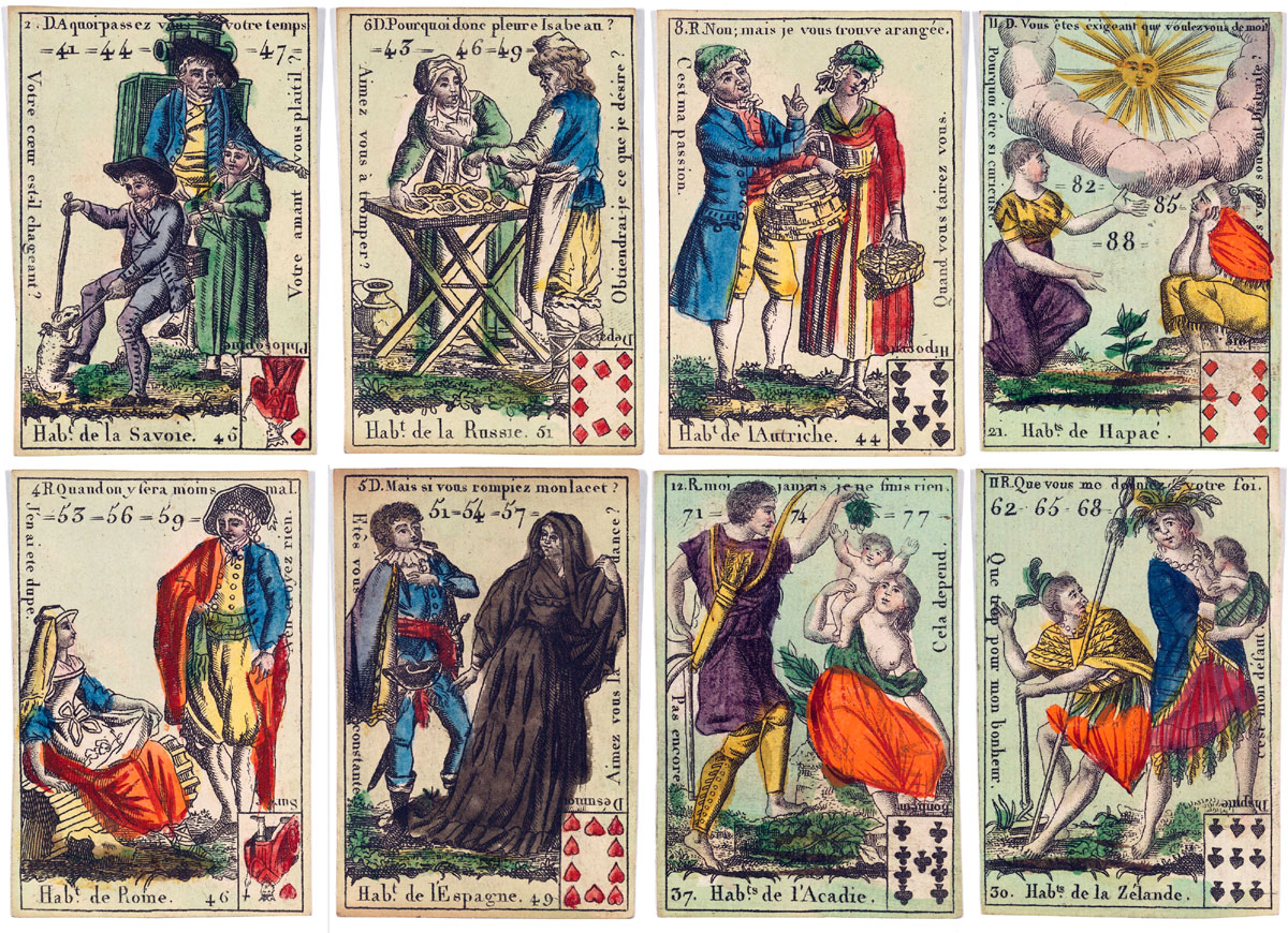 The set contains 32 cards depicting clothing and costumes from various geographic regions: 4 ‘Continent’ cards and 4 ‘Virtue’ cards; the remaining 24 cards have what resemble fortune-telling or love-motto questions (D) and answers (R), as in the Jeu d'Or (above). In the bottom right-hand corner can be found a reversed miniature playing card with a keyword suggesting an outcome, such as Departure, Grief or Desire.
