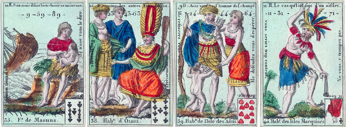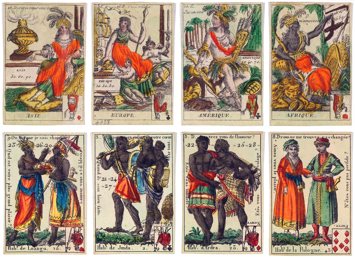 The cards also allude to the “Four Continents” theme inspired by Europe's increasing exploration, trade, and colonization of various parts of the world. The illustrations arouse fascination with exotic and unfamiliar locations from the four corners of the world. The topic had given rise to a book publishing industry specialising in accounts of voyages to remote parts of the world, the peoples, different religions, forms of government and ways of life encountered. Several such books had been produced with the collaboration of Jacques Grasset Saint-Sauveur (1757-1810), a former diplomat, traveller and writer who is also known to have been part of the cartomancy scene and whose work probably inspired these cards.