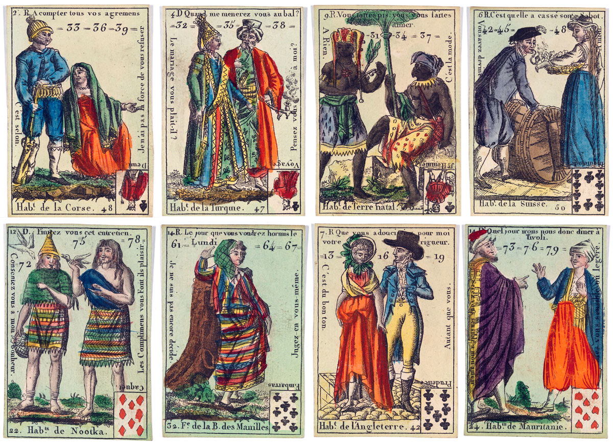 Two nearly identical decks on The Metropolitan Museum of Art website contain 32 cards each. These decks depict people from Europe, Asia, Africa, and America, showcasing their physical attributes, clothing, and common demeanours. Additionally, both sets include elements for fortune-telling and share nearly identical designs, typography, and layouts. These decks align with the late 18th-century French trend of cartomancy cards, influenced by the contributions of Etteilla, his peers, and their successors.