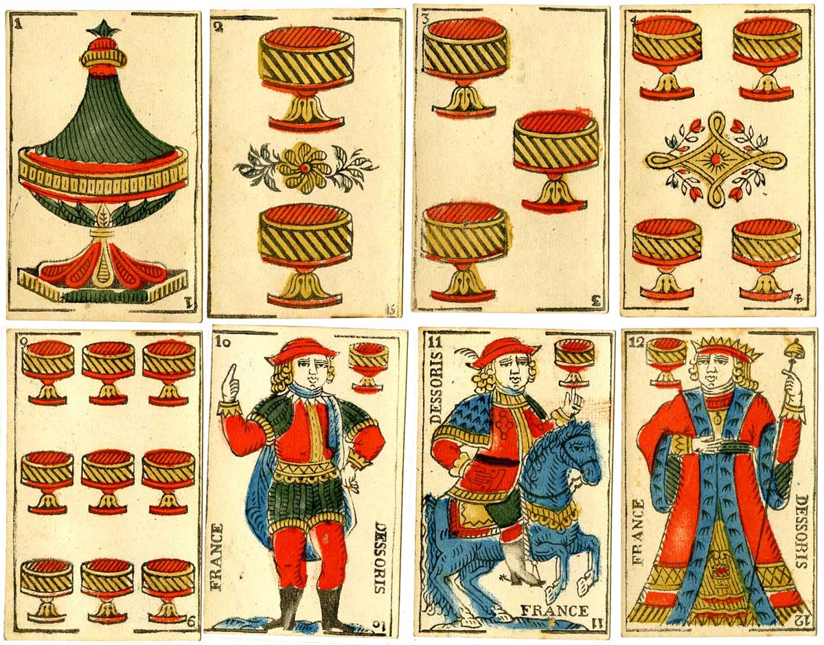 The Dessoris cardmaking dynasty was founded by François Dessoris who settled in Pepignan in 1805-1806. Apprenticed in a playing card factory in Montpellier, he married the daughter of the owner: Marie-Antoinette Boissonnade. He then inherited the family business which he transferred to Perpignan. He died in 1843 and his son Joseph Dessoris succeeded him. He in turn disappeared in 1845 and it was the women who managed the business until the end of the 19th century (Jean-Pierre Garrigue, 2014).