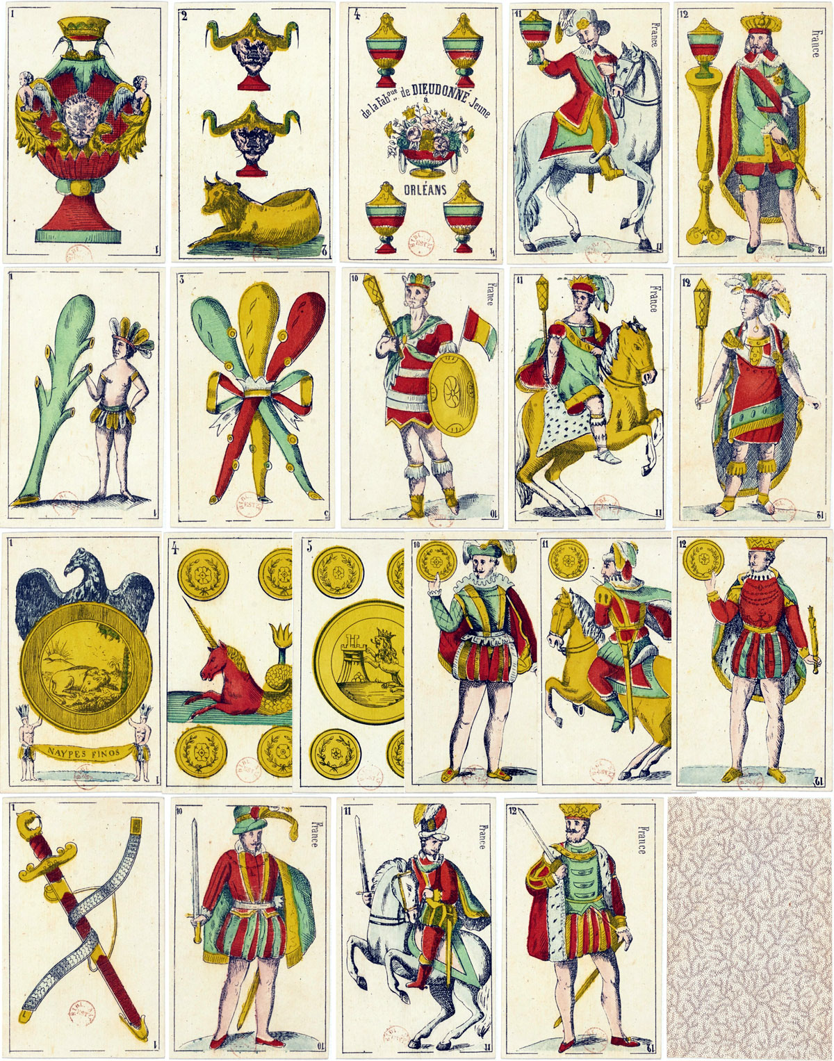 Aluette pack produced by Jean Dieudonné (1811-1886), a Dieudonné family descendent who had emigrated to Orleans, France. He was the son of the Luxembourgish card-maker Matthias Dieudonné and Catherine Schmidt. He married Eugénie-Catherine Lamy on April 16, 1845. He was first associated with his brother Jean-Mathieu between 1841 and 1845 trading as Dieudonné frères, after which he then ran his own factory named Dieudonné Jeune. The cards in this 48-card pack show several Spanish stylistic characteristics including ‘pintas’ or border-breaks, with the legend “Naipes Finos” on the ace of coins, and are said to be intended for the Spanish market.